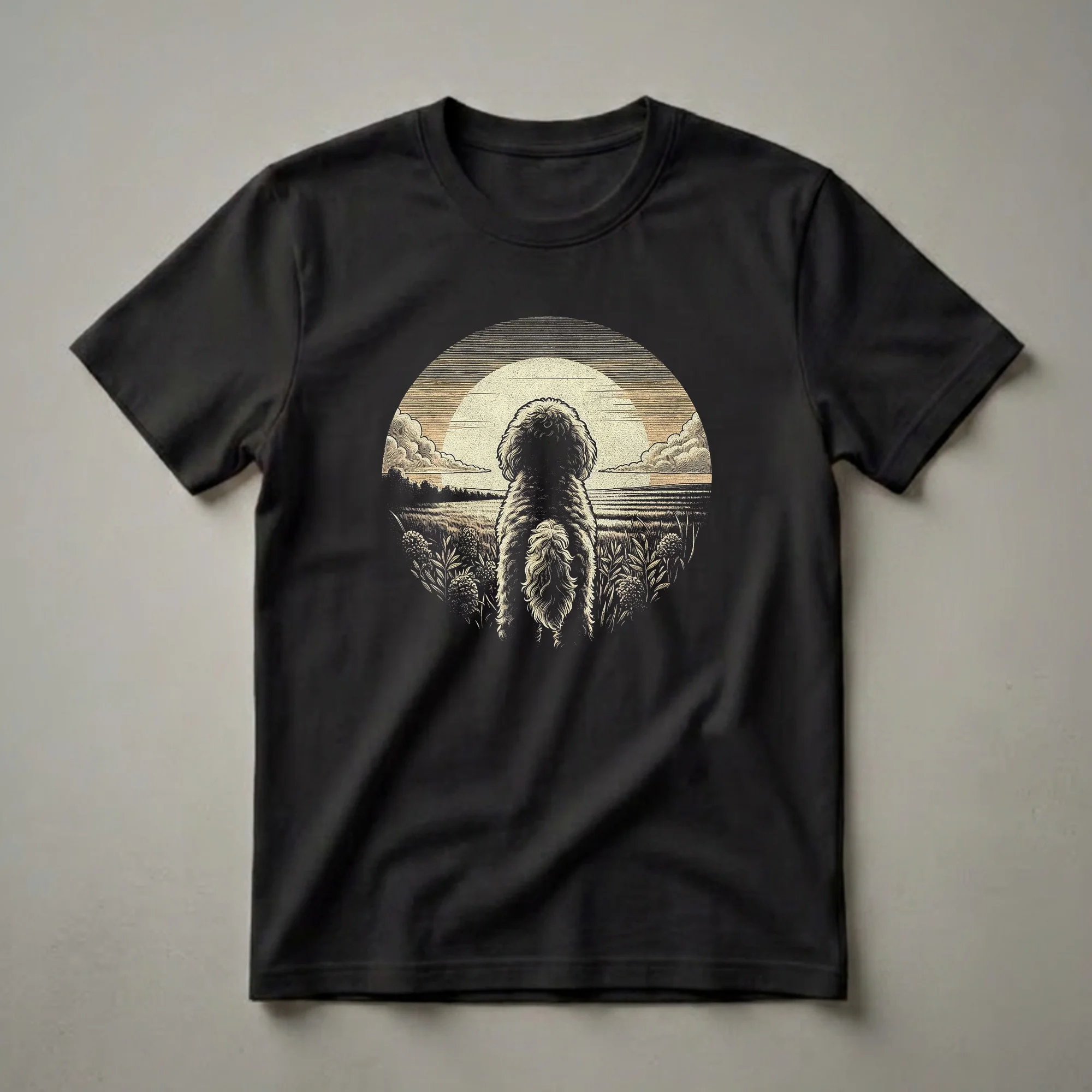 Cavapoo owners who appreciate a touch of vintage charm will adore this unique graphic tee. The design showcases a Cavapoo, a crossbreed known for its friendly disposition and hypoallergenic coat, from behind as it surveys a picturesque landscape. The scene unfolds within a circular frame, evoking a classic woodcut or linocut aesthetic. Tall grasses and wildflowers dot the foreground, leading the eye towards a distant treeline and a vast field. Dominating the sky is a large, stylized sun, rendered with concentric lines, suggesting a sunset or sunrise. Fluffy clouds drift across the horizon, adding depth to the serene natural setting. This shirt is a thoughtful gift for the Cavapoo mom in your life who loves to express her affection for her furry companion. It's a go-to tee for casual outings, walks in the park, or simply relaxing at home, allowing her to wear her love for her dog with pride. The retro design makes this t-shirt a standout piece for any dog enthusiast's wardrobe, celebrating the bond between humans and their canine friends.