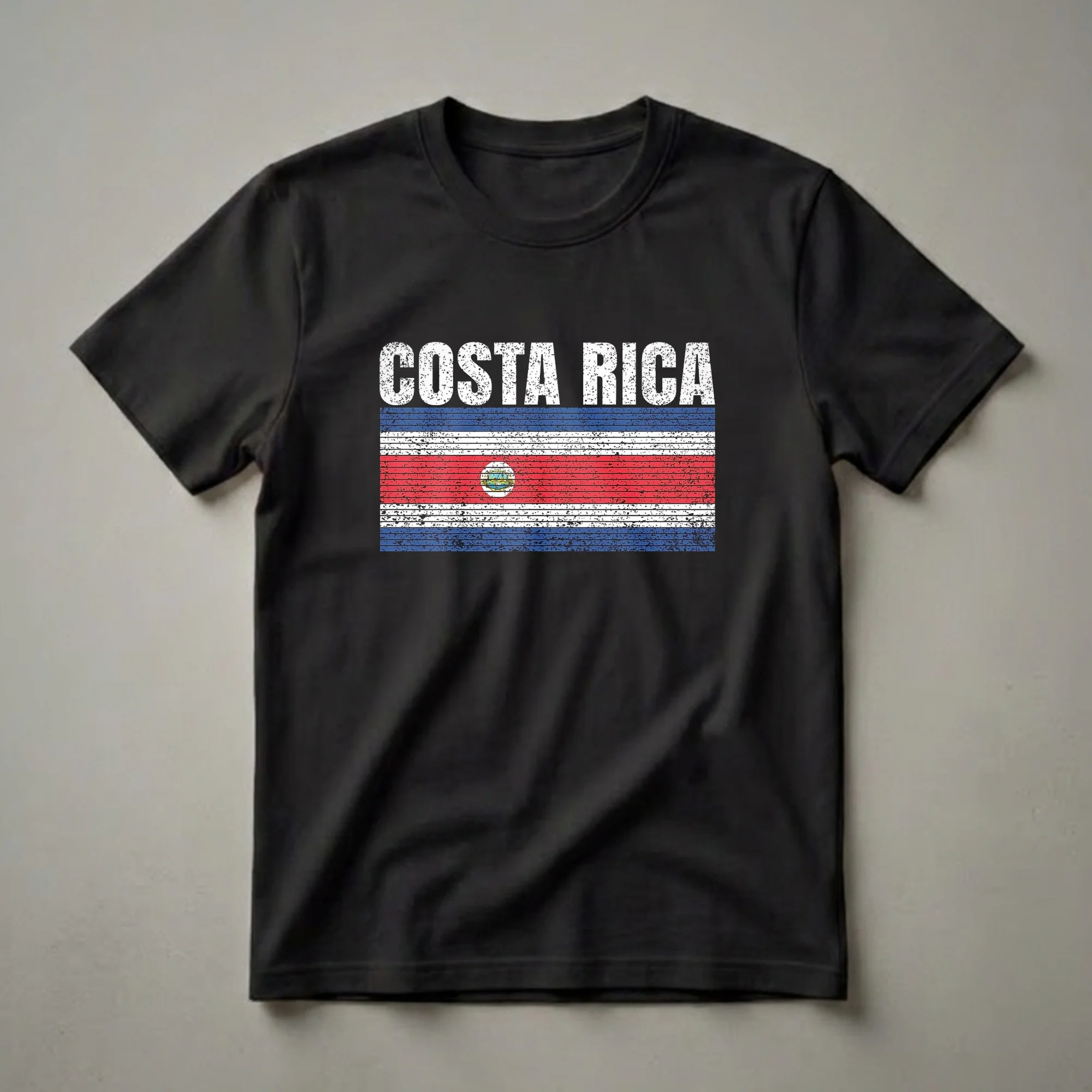 Costa Rican heritage is celebrated with this striking graphic tee, featuring the nation's flag in a distressed vintage style. Bold white letters spelling 'COSTA RICA' sit proudly above the iconic horizontal stripes of blue, white, and red, with the national coat of arms centered on the red band. This design evokes a sense of nostalgia and pride for those connected to the Central American nation. Costa Rica is renowned for its incredible biodiversity, with over 25% of its land protected in national parks and reserves, making it a haven for eco-tourism and wildlife enthusiasts. This shirt is a thoughtful gift for any proud Costa Rican, whether they live in the country or abroad, or for someone who has fallen in love with its natural beauty and vibrant culture. It's a great way to wear your national pride, a thoughtful choice for casual outings, family gatherings, or while reminiscing about adventures in this beautiful country. This t-shirt serves as a constant reminder of the 'Pura Vida' lifestyle.