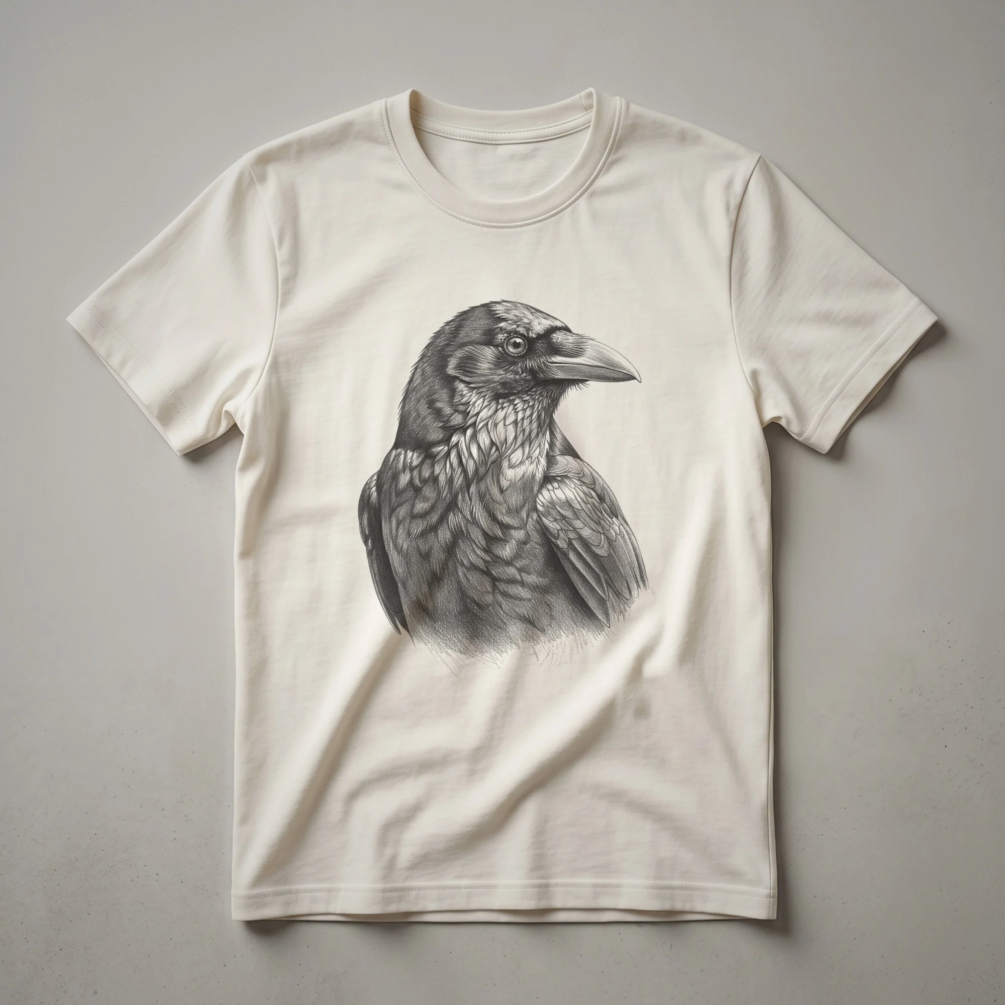 Bird enthusiasts and admirers of classic illustration will appreciate this vintage crow drawing t-shirt. The design features a detailed, black and white line art depiction of a crow or raven, rendered with intricate feather detail that gives it a timeless, artistic feel. Crows and ravens, members of the Corvid family, are known for their intelligence and adaptability, often found in diverse habitats across the Northern Hemisphere. This graphic tee is a thoughtful gift for anyone fascinated by these intelligent birds, whether they are avid birdwatchers, nature photographers, or simply appreciate unique wildlife art. Wear this shirt on your next nature walk, to a casual outing, or while enjoying a quiet moment observing the natural world. It's a staple in the collection for those who admire the beauty and mystique of these captivating creatures. This shirt makes a thoughtful gift for the ornithologist in your life.