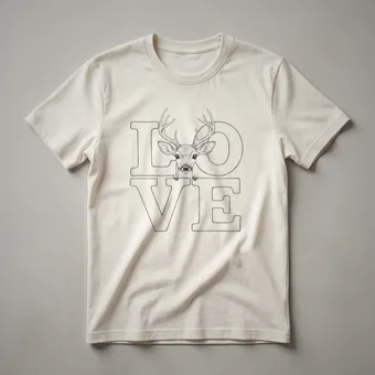 - Features a detailed vintage line drawing of a deer head with a heart in its antlers.