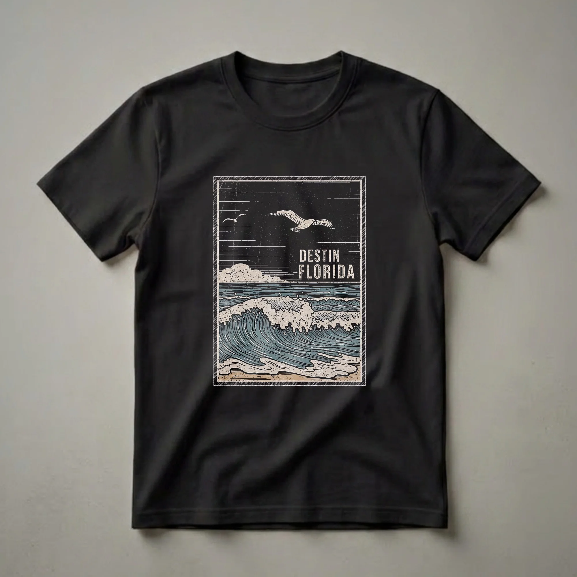 - Capture the essence of Destin, Florida, with this vintage wave and seagull art tee.