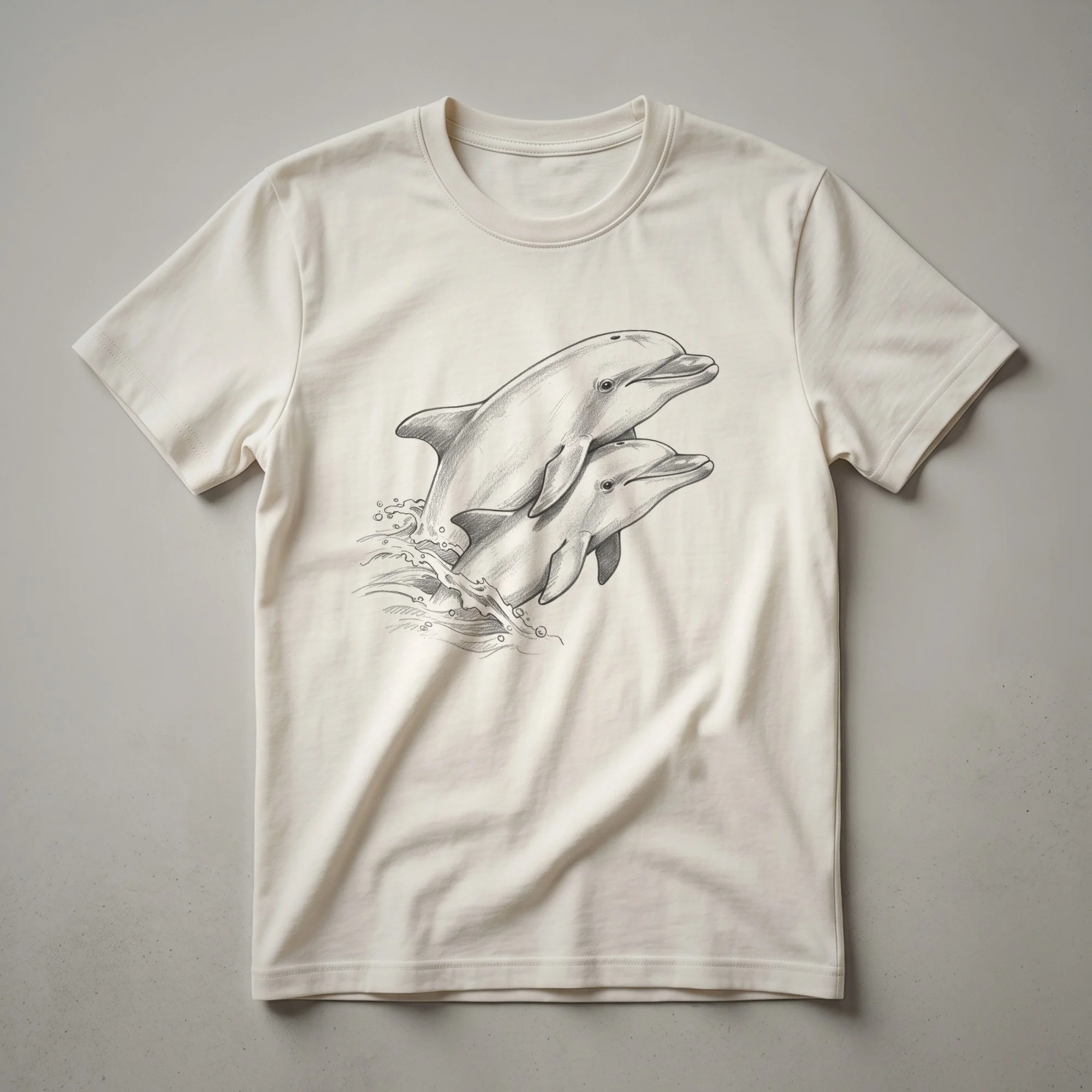 Marine life enthusiasts will appreciate this striking graphic tee featuring a vintage-style drawing of two dolphins in mid-leap. Dolphins, known for their intelligence and playful nature, are depicted in a classic artistic rendering that evokes a sense of nostalgia and appreciation for the ocean's wonders. These cetaceans are found in oceans worldwide, from temperate to tropical waters, and are often observed leaping from the water, a behavior known as 'porpoising,' which helps them breathe and travel efficiently. This shirt is a wonderful way for anyone who loves the sea to express their passion. It makes a thoughtful gift for oceanographers, divers, or anyone who finds joy in the beauty of marine animals. Wear this t-shirt to the beach, on a boat trip, or simply as a conversation starter about the fascinating world beneath the waves. This eye-catching apparel is a staple for any ocean lover's wardrobe, offering a unique blend of art and appreciation for nature.