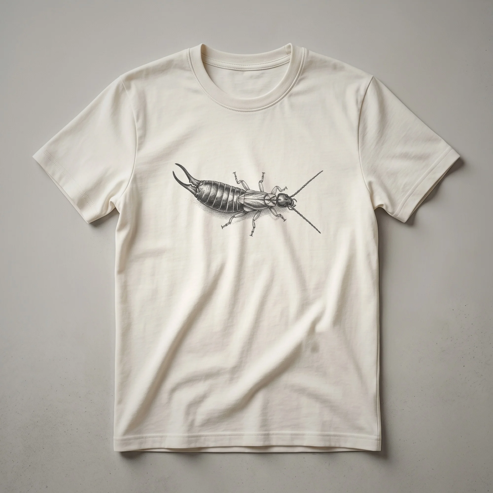 - This tee features a distinctive vintage black and white drawing of an earwig.
