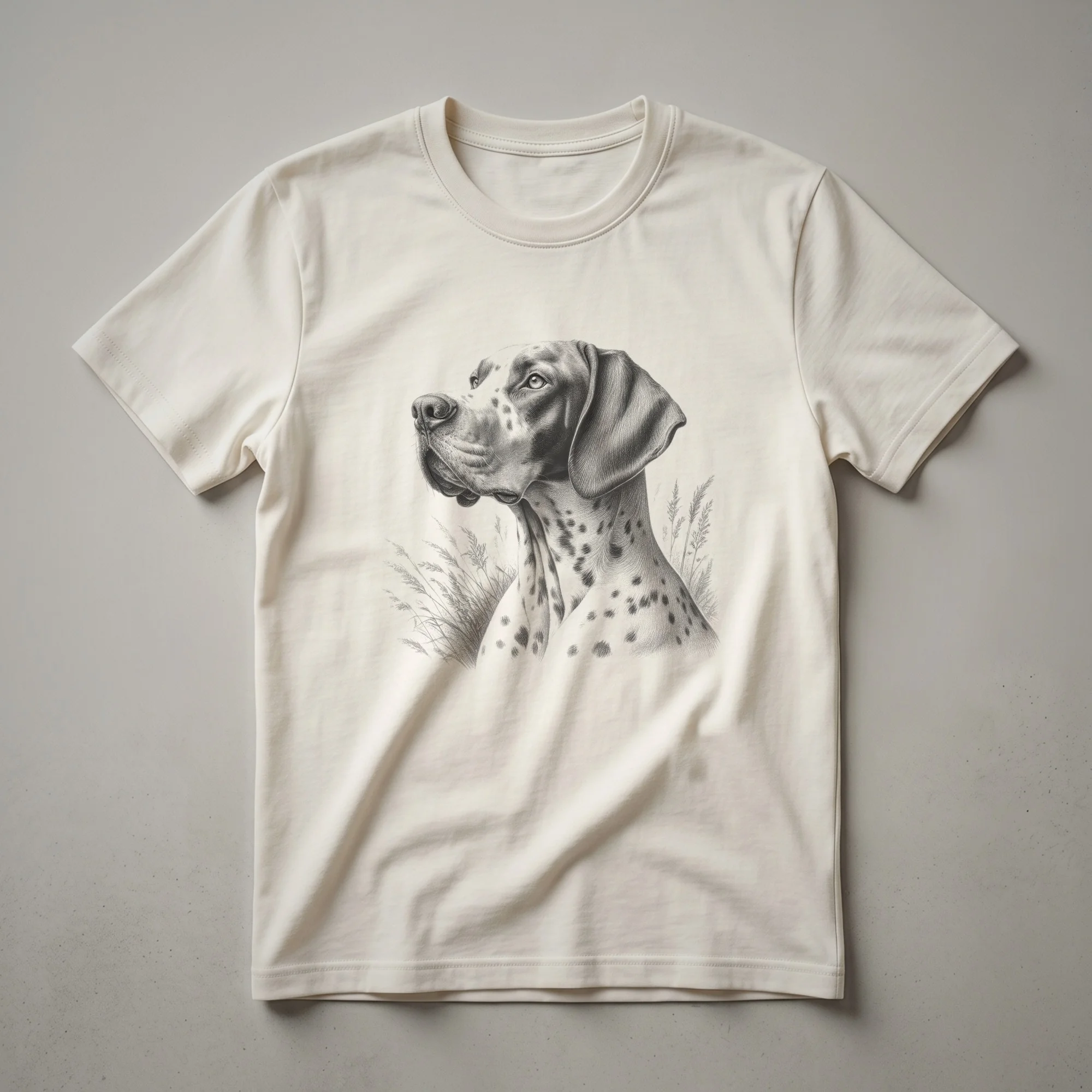 English Pointer owners who appreciate classic canine artistry will reach for this distinctive tee. The design features a striking black and white line drawing of an English Pointer in a classic profile pose, capturing the breed's elegant stance and keen expression. This artistic rendition evokes the breed's heritage as a dedicated hunting companion, known for its stamina and pointing ability. English Pointers, originating from Spain and developed in Great Britain, are renowned for their athletic build and gentle temperament, making them cherished family pets. This shirt is more than just apparel; it's a statement piece for those who understand the unique bond shared with these intelligent dogs. It makes a thoughtful gift for any dog mom or dog dad who admires the breed's grace and hunting prowess. Wear this unique t-shirt to your next dog park visit or casual outing to spark conversations with fellow enthusiasts. It's a staple in the collection for anyone who cherishes the beauty and spirit of the English Pointer.