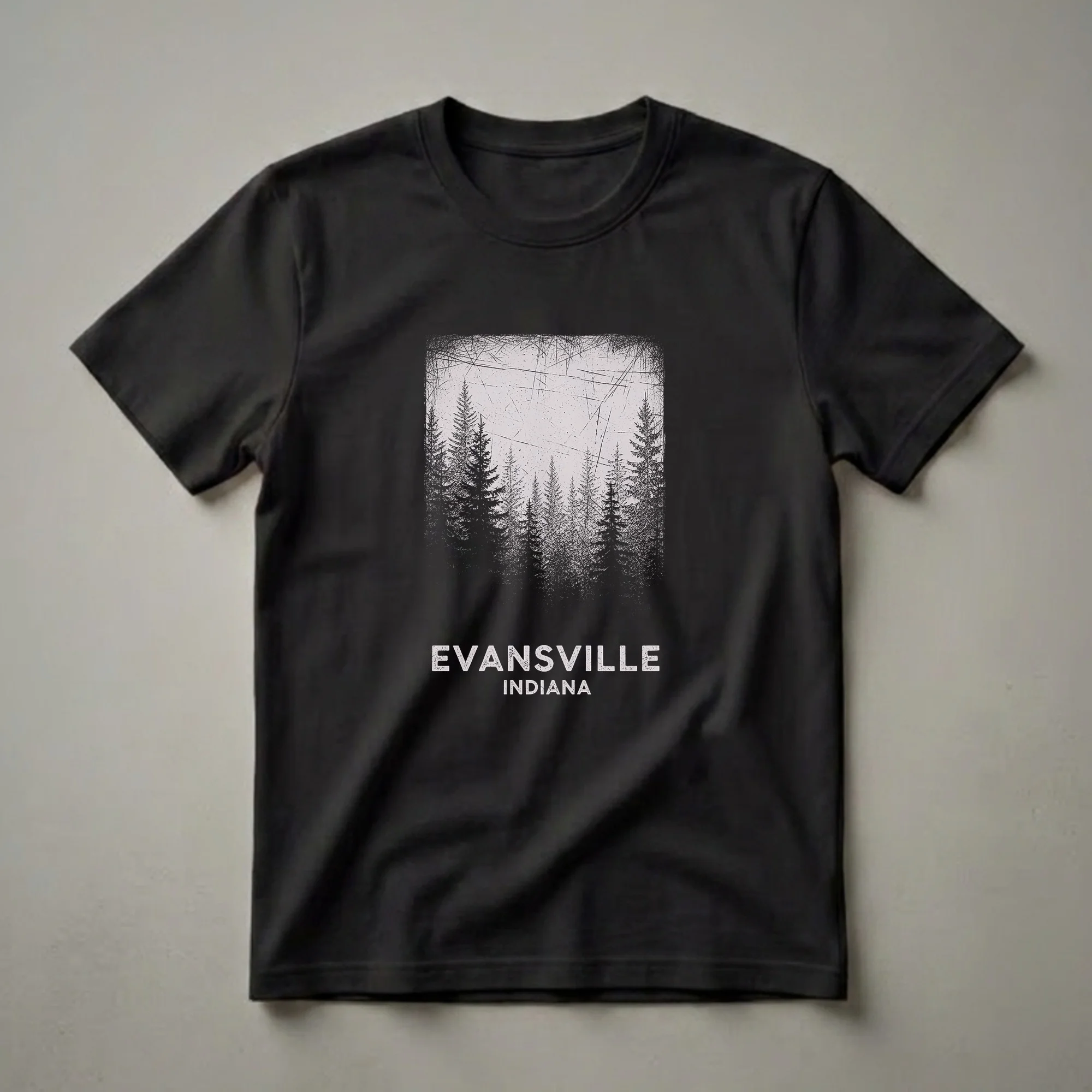 Evansville, Indiana residents and visitors can now wear their pride with this striking graphic t-shirt. The design features a vintage-style illustration of a dense pine forest, evoking the natural beauty found in the Midwest. The trees are rendered in a dark, silhouetted style against a textured, light background, complete with distressed lines and speckles that give it an authentic retro feel. Below the forest scene, the words "EVANSVILLE" and "INDIANA" are prominently displayed in a bold, distressed font, clearly identifying the city and state. This tee is a thoughtful gift for anyone who calls Evansville home, has fond memories of the area, or simply appreciates nature-inspired apparel. It's a go-to tee for casual outings, exploring the city, or showing off your Hoosier state pride. The unique artistic style makes this shirt a standout piece for your wardrobe, great to wear to local events or while reminiscing about the charm of southern Indiana. This shirt works well for anyone looking to connect with their roots or celebrate their connection to this vibrant Indiana city.