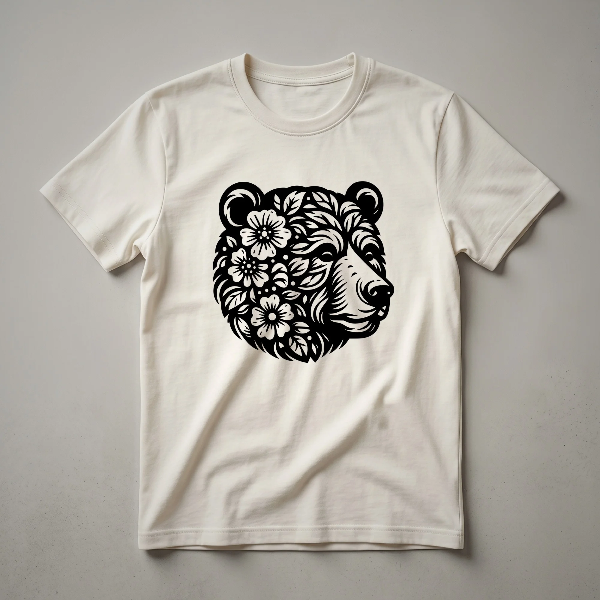 Wildlife enthusiasts who appreciate the rugged beauty of bears will reach for this unique graphic tee. The design features a stylized drawing of a bear's head, intricately adorned with blooming flowers, creating a striking blend of nature's strength and delicate beauty. This artistic representation captures the essence of these magnificent mammals, often found roaming vast forests and mountainous terrains across North America and Eurasia. Bears, known for their powerful build and omnivorous diet, play a crucial role in their ecosystems, from seed dispersal to maintaining the health of vegetation. This t-shirt is more than just apparel; it's a statement piece for anyone who feels a connection to the wild. It makes a thoughtful gift for hikers, nature photographers, or anyone who admires the untamed spirit of the wilderness. Wear this shirt on your next outdoor adventure or casual outing to express your passion for the natural world. This comfortable tee is a staple for any nature lover's wardrobe, offering a distinctive look that stands out.