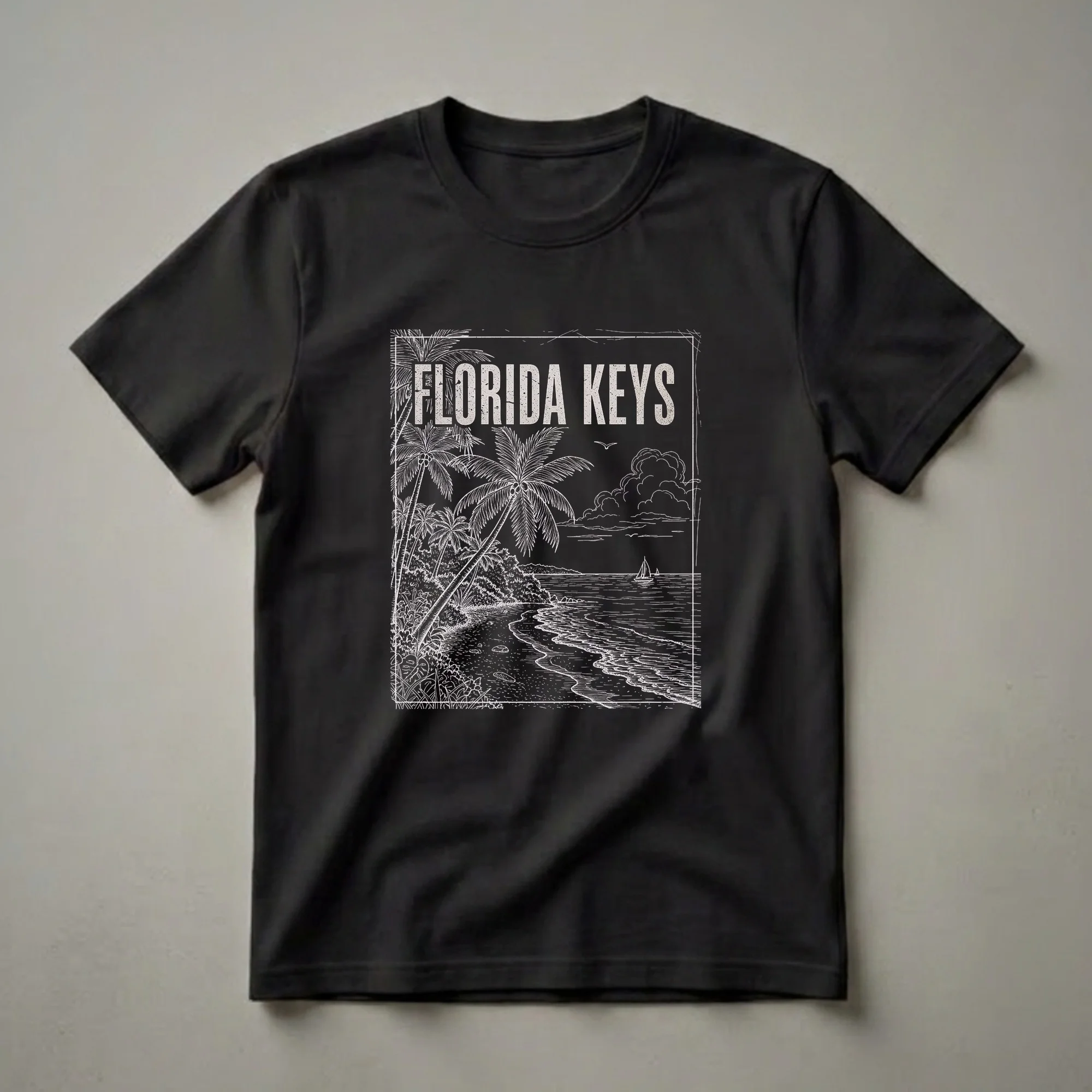 Embrace the nostalgic charm of the Sunshine State with this vintage-inspired graphic tee showcasing a classic Florida Keys beach scene. The striking black and white line art depicts a serene beach scene, complete with lush palm trees lining the shore and two sailboats gliding across the calm ocean waters under a cloudy sky. This design evokes the laid-back atmosphere and natural beauty that makes the Florida Keys a unique destination. The Florida Keys, a coral archipelago stretching from Florida's southern tip, are known for their vibrant coral reefs, diverse marine life, and iconic Overseas Highway connecting the islands. This shirt is a thoughtful gift for anyone who has experienced the magic of Key West, Marathon, or Islamorada, or for those dreaming of their next tropical getaway. Wear this tee to relive memories of sunny days, ocean breezes, and the distinctive charm of South Florida's island chain, making it a go-to shirt for casual outings or vacation wear.