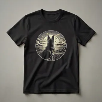 German Shepherd owners who appreciate classic art and the loyalty of their canine companions will reach for this striking graphic tee. The design features a German Shepherd, viewed from behind, gazing out at a circular landscape. A large, stylized sun with radiating lines dominates the background, partially obscured by dramatic, textured clouds. Below the sun, a serene body of water is depicted, bordered by rolling hills and tall grasses in the foreground, all rendered in a detailed, vintage engraving style. Several small birds are scattered across the sky, adding a touch of life to the scene. This shirt is a thoughtful gift for any German Shepherd mom or dad who cherishes the breed's intelligence and protective nature. German Shepherds are known for their versatility, often serving as working dogs in roles such as police K9s or service animals, reflecting their strong bond with humans. This t-shirt is a thoughtful choice for casual outings, walks in the park, or simply relaxing at home, allowing you to wear your passion for your loyal friend.