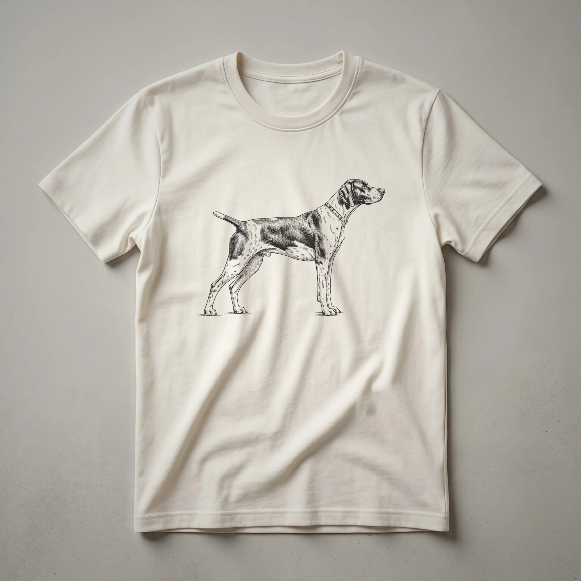 German Shorthaired Pointer owners know the breed's versatility and energetic spirit. This vintage-style sketch art tee captures the noble profile of a GSP, rendered with fine linework that evokes classic wildlife illustrations. The detailed drawing showcases the dog's athletic build, alert stance, and distinctive collar, making it a striking piece of apparel for any dog enthusiast. German Shorthaired Pointers, originally bred in Germany during the 19th century, are renowned for their intelligence, eagerness to please, and exceptional hunting abilities, particularly in pointing and retrieving game. This shirt is a thoughtful gift for the dog mom or dad who cherishes their loyal companion, or for anyone who admires the breed's elegant form and spirited nature. Wear this unique t-shirt to your next dog park visit, a casual outing with friends, or simply while relaxing at home with your beloved canine. It's a staple in the collection for those who appreciate the artistry of dog breeds and the bond they share with humans.