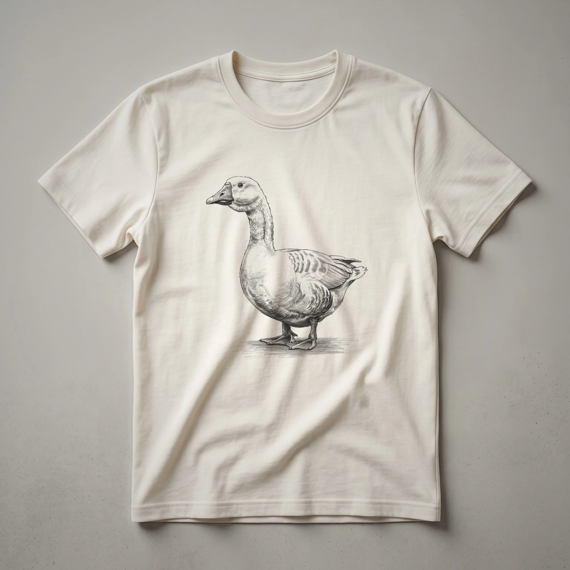 Bird watchers and nature enthusiasts will appreciate the understated elegance of this vintage goose drawing t-shirt. The design features a detailed black and white line art illustration of a goose, captured in profile with its head gracefully lowered. This graphic tee offers a classic, artistic representation of the waterfowl, evoking a sense of natural beauty and tranquility. Geese are known for their strong social bonds and migratory patterns, often traveling in V-formations to conserve energy during long journeys. This shirt is a thoughtful gift for anyone who finds joy in observing wildlife, whether they are avid birdwatchers, enjoy hiking in natural habitats, or simply admire the artistry of vintage illustrations. Wear this comfortable tee on your next outdoor adventure, to a casual brunch, or while relaxing at home, and let your appreciation for these fascinating creatures be known. It's a staple in the collection for those who connect with the natural world.