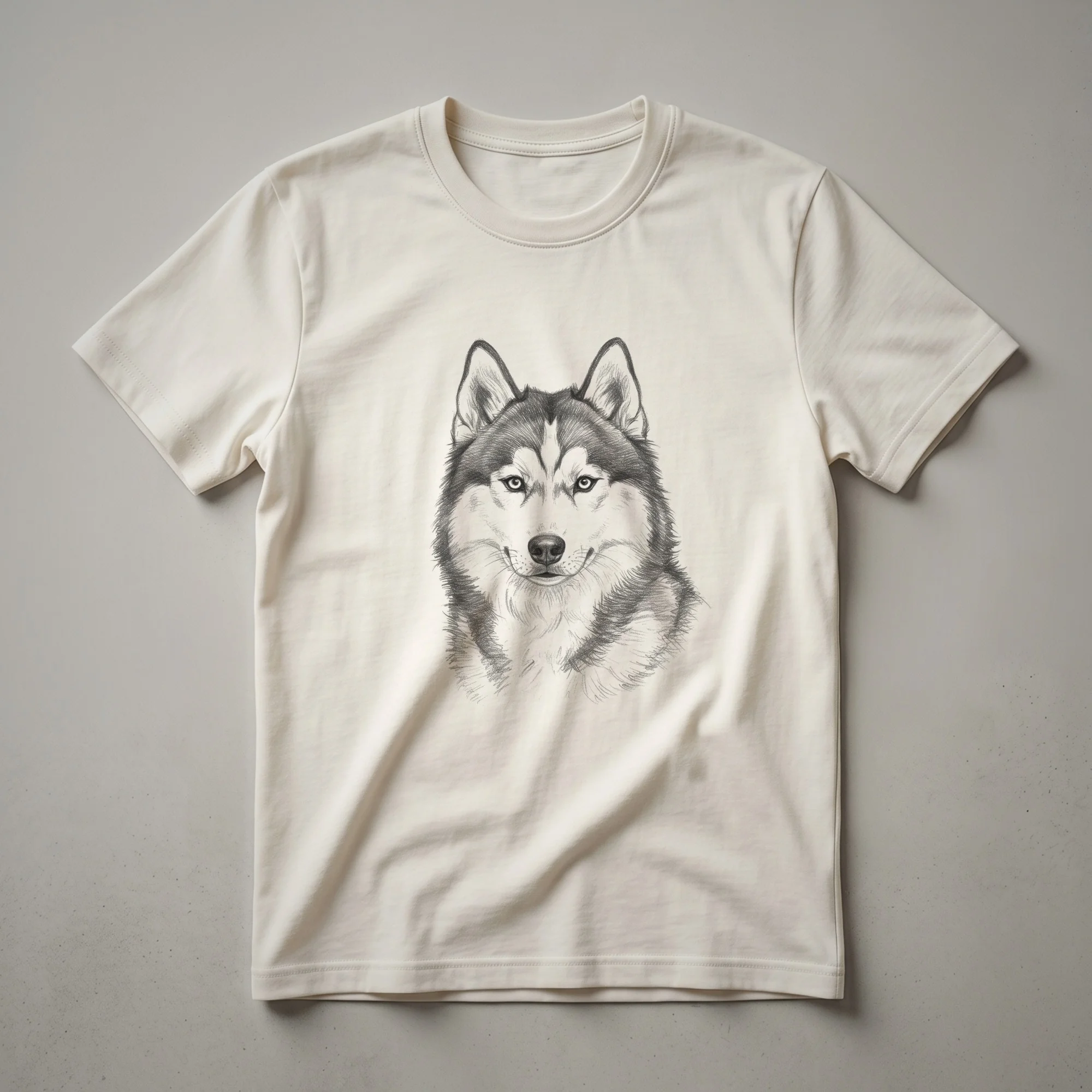Siberian Huskies, known for their striking blue or multi-colored eyes and thick double coats, are a breed celebrated for their endurance and friendly nature. This vintage-style drawing captures the noble profile of a husky, rendered in a classic black and white sketch that evokes a sense of timeless appeal. The artwork features the dog's alert ears, expressive eyes, and characteristic facial markings, presented with a slightly distressed aesthetic that enhances its retro charm. This graphic tee is a fantastic way for dog moms and dog dads to express their affection for this spirited breed. Huskies originated in Northeast Asia and were bred by the Chukchi people for sled pulling and companionship, showcasing their deep connection to human families. This shirt works well for casual outings, dog park visits, or simply relaxing at home. It makes a thoughtful gift for any husky owner, celebrating the unique bond between humans and these remarkable animals. Wear this unique t-shirt to show off your appreciation for canine art and your favorite furry friend.