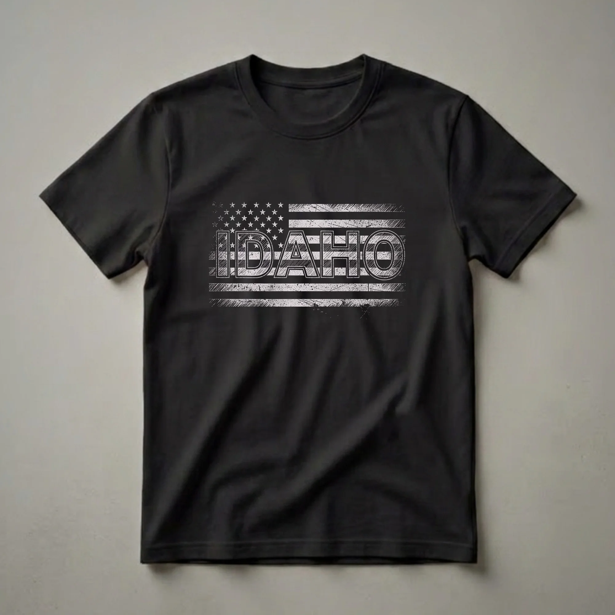 Idaho residents and fans of the Gem State can now wear their pride with this striking graphic t-shirt. The design features a distressed American flag, complete with faded stripes and stars, overlaid with the bold, block letters spelling out 'IDAHO'. This retro-inspired graphic tee evokes a sense of nostalgia and patriotism, making it a go-to choice for anyone who loves the state. Idaho, known for its stunning natural beauty, including vast wilderness areas and the majestic Rocky Mountains, offers a unique landscape that resonates with its inhabitants. This shirt is a thoughtful gift for anyone who calls Idaho home, whether they've lived there their whole life or recently moved to the state. It's a great way to represent your roots or your favorite place. Wear this shirt to casual outings, while exploring the great outdoors, or to local events to showcase your Idaho spirit. This apparel is a comfortable and stylish way to celebrate your connection to the state.
