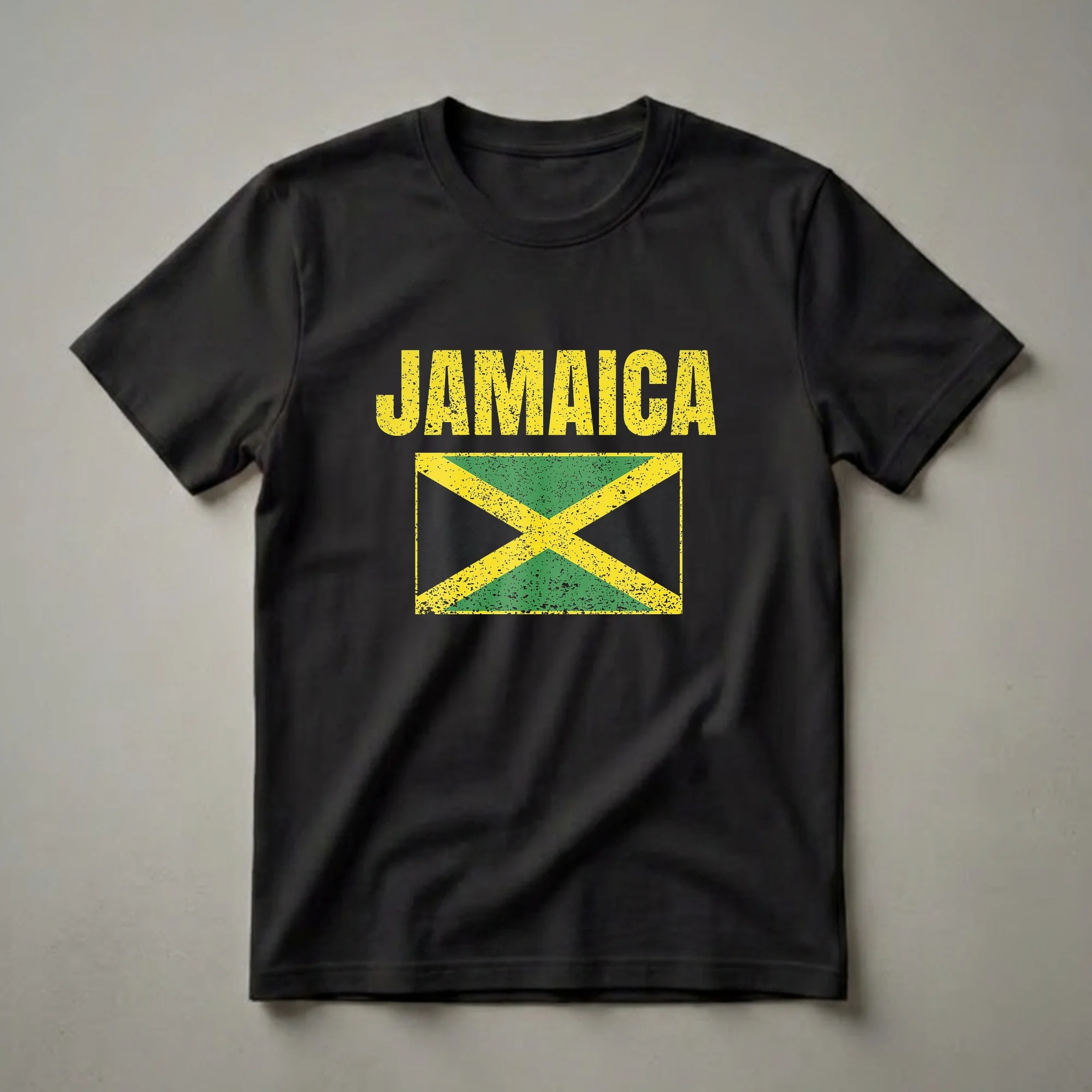 Jamaican heritage is celebrated with this striking graphic tee, featuring the iconic Jamaican flag. The flag's design, a saltire of gold on a black field with green triangles, is presented with a distressed, vintage effect, giving it a timeless appeal. Above the flag, the word "JAMAICA" is emblazoned in bold, distressed yellow lettering, reinforcing the national pride. This shirt is a fantastic way for Jamaicans, those of Jamaican descent, or anyone who admires the island nation to showcase their connection. Jamaica, known for its rich culture, reggae music, and stunning landscapes, offers a unique identity that this apparel captures. This t-shirt works well for casual wear, cultural events, or as a thoughtful gift for someone who cherishes their Jamaican roots. Whether you're celebrating Jamaican Independence Day or simply want to wear your heritage with pride, this graphic shirt is a standout choice. It's a staple for anyone looking to express their love for Jamaica.