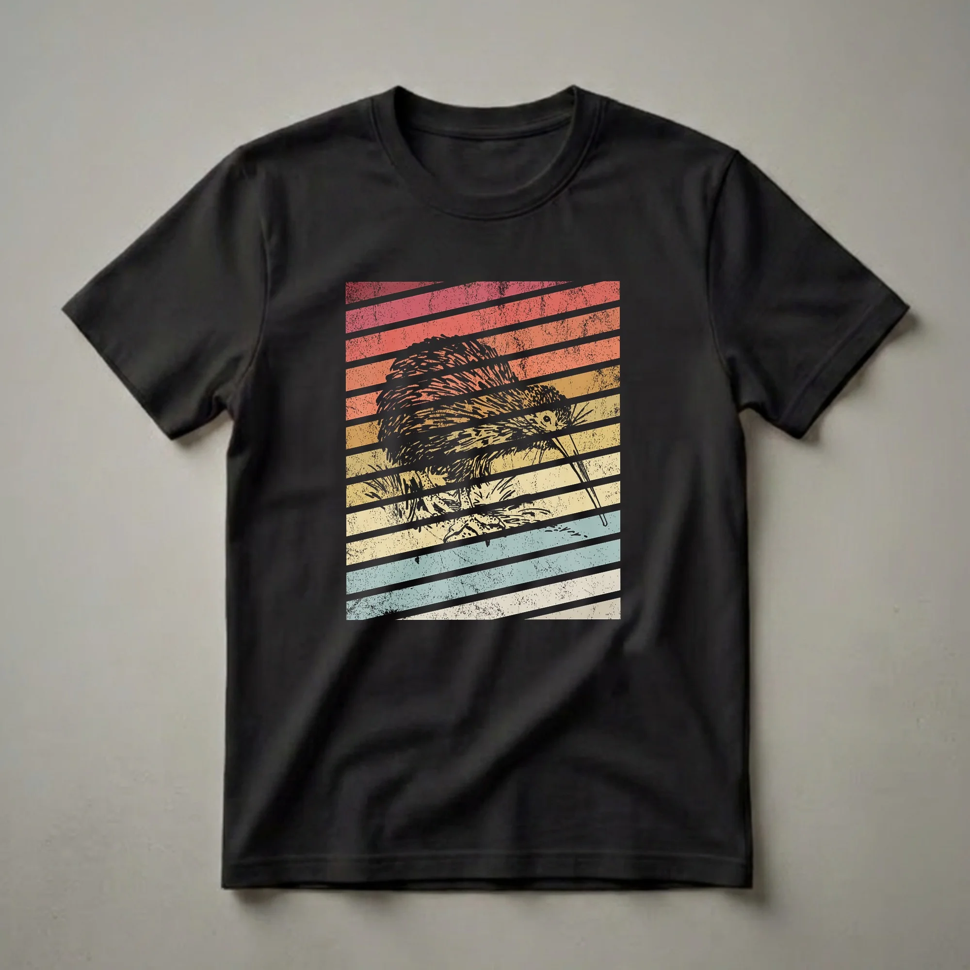New Zealand's native kiwi bird, a symbol of the country, is celebrated on this vintage-style graphic tee. The striking black illustration of the flightless bird is set against a backdrop of distressed horizontal stripes in a warm, sunset palette of reds, oranges, yellows, and blues. This unique design captures the essence of the kiwi, known for its nocturnal habits and long beak used for foraging in the undergrowth. Kiwis are fascinating creatures, belonging to the ratite family, which also includes ostriches and emus, though they are the smallest of their kind. This shirt is a perfect way for bird enthusiasts, wildlife lovers, or anyone with an appreciation for unique avian species to express their passion. It makes a thoughtful gift for someone who admires these shy, ground-dwelling birds. Wear this tee to casual outings, nature walks, or while sharing your love for ornithology. It's a comfortable and eye-catching addition to any nature lover's wardrobe, offering a touch of retro charm and a conversation starter about these iconic New Zealand natives.