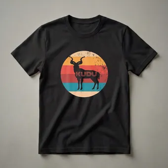 Kudu owners and admirers will reach for this striking graphic tee, celebrating the majestic spiral-horned antelope. The design features a bold black silhouette of a kudu, complete with its iconic, twisting horns, set against a distressed circular background of retro sunset stripes in cream, orange, red, and teal. The word "KUDU" is emblazoned across the animal's body in a unique, stylized font that echoes the vintage aesthetic. Kudus, native to eastern and southern Africa, are known for their impressive size and distinctive markings, making them a fascinating subject for any wildlife enthusiast. This t-shirt is a thoughtful gift for anyone who appreciates African wildlife or enjoys retro-inspired apparel. Wear this shirt on your next nature walk, to a casual gathering, or simply while relaxing at home, and let your passion for these magnificent creatures shine. It's a staple in the collection for any lover of antelope and vintage designs.