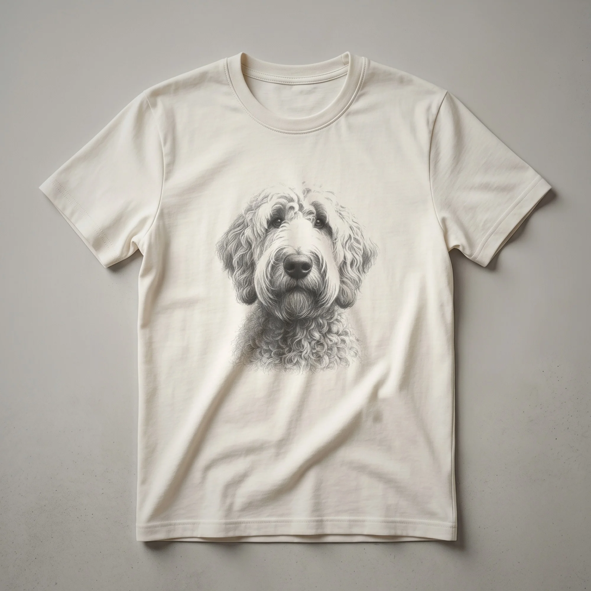 Labradoodle owners who appreciate classic art will reach for this unique graphic tee. This shirt features a detailed, vintage-style line drawing of a Labradoodle, capturing the breed's friendly and intelligent expression. The artistic rendering gives the dog a timeless appeal, making it a standout piece for any canine enthusiast. Labradoodles, a crossbreed between a Labrador Retriever and a Poodle, are known for their playful personalities and hypoallergenic coats, making them popular family pets. This t-shirt is a wonderful way to celebrate your furry companion. It makes a thoughtful gift for the Labradoodle mom or dad in your life who cherishes their dog's unique charm. Wear this comfortable tee to casual outings, dog park visits, or simply while relaxing at home with your beloved pet. It's a staple in the collection for anyone who adores this beloved mixed breed. The simple yet striking design ensures it pairs well with various casual outfits, offering a subtle nod to your passion for dogs.