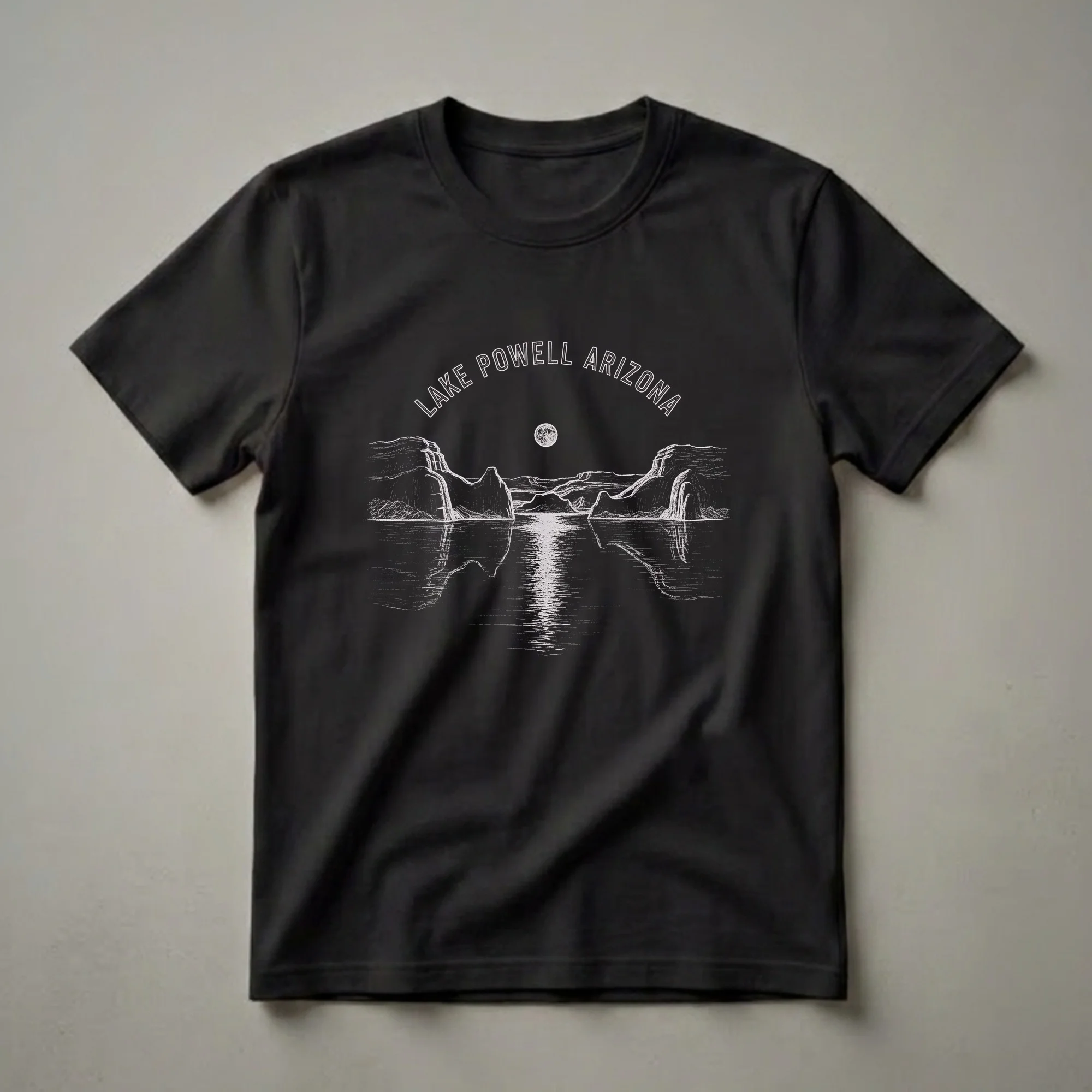 This striking graphic tee features a vintage sketch art design of Lake Powell, Arizona, under a luminous full moon. The detailed linework captures the iconic sandstone cliffs and the serene, reflective waters of the lake, creating a timeless and artistic representation of this natural wonder. Lake Powell, a reservoir on the Colorado River straddling the border of Arizona and Utah, is renowned for its stunning canyons and vibrant blue waters, making it a popular destination for outdoor enthusiasts. This shirt is a thoughtful gift for anyone who has visited or dreams of visiting this breathtaking location, or for those who appreciate unique landscape art. It's a go-to tee for casual outings, road trips through the Southwest, or simply relaxing while reminiscing about desert landscapes. Wear this shirt to showcase your love for Arizona's natural beauty and the iconic vistas of Lake Powell. The sketch style offers a unique, artistic flair that stands out, making it a conversation starter for fellow travelers and art aficionados alike. This t-shirt is a wearable piece of art, celebrating the majestic scenery of the American Southwest.