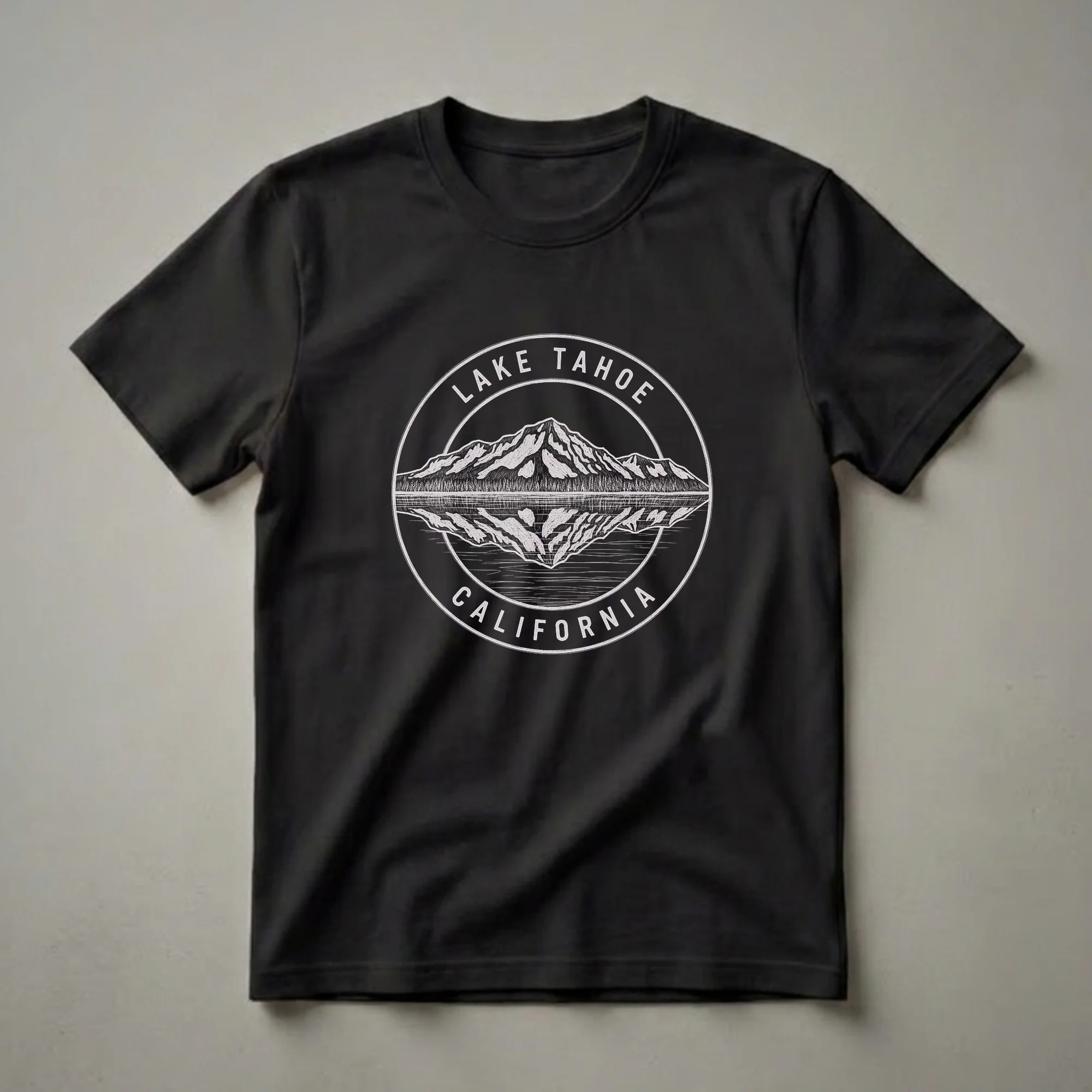 Lake Tahoe, a stunning freshwater lake nestled in the Sierra Nevada mountains, straddling the border of California and Nevada, is celebrated on this unique graphic tee. The design captures the majestic peaks of the surrounding mountains, their rugged beauty rendered in a vintage sketch art style. These mountains are mirrored in the calm, reflective waters of the lake, creating a symmetrical and eye-catching visual. The text "LAKE TAHOE" arcs above the scene within a circular border, while "CALIFORNIA" is inscribed below, grounding the iconic location. This t-shirt is a thoughtful gift for anyone who cherishes the natural splendor of the Golden State, particularly those who have experienced the breathtaking vistas of Lake Tahoe. It's a staple for hikers, nature lovers, or anyone who dreams of the alpine scenery. Wear this shirt to your next outdoor adventure or casual outing, and let your apparel speak to your appreciation for this remarkable destination. This tee works well for Californians and visitors alike, serving as a wearable memento of unforgettable trips.