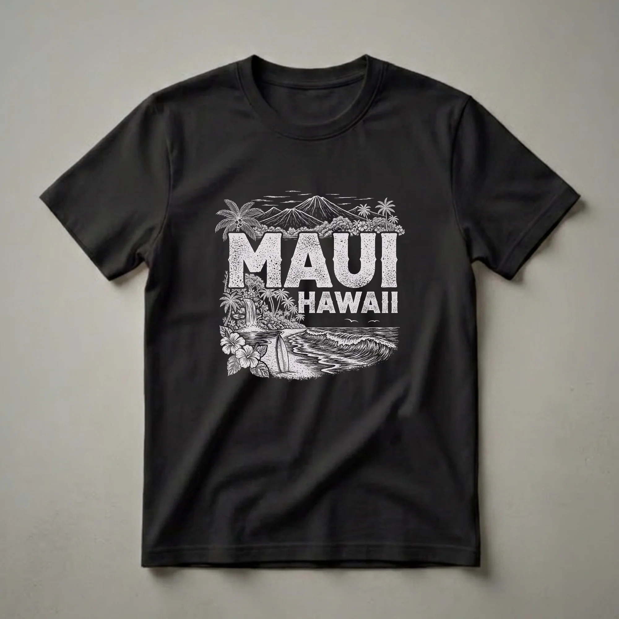 Maui, the 'Valley Isle,' beckons with its diverse landscapes, from the volcanic peaks of Haleakalā to the lush rainforests and stunning beaches. This graphic tee captures that iconic island spirit with a vintage-style drawing. The artwork showcases a serene beach scene, complete with a surfboard resting on the sand, ready for the next wave. Towering palm trees frame the view, leading to majestic mountains in the distance, hinting at the island's dramatic topography. A cascading waterfall flows into a tranquil pool, surrounded by vibrant hibiscus flowers, embodying the tropical beauty of Hawaii. The dynamic ocean waves crashing on the shore evoke the world-renowned surf culture that Maui is famous for. This shirt is a go-to tee for anyone who dreams of the Hawaiian islands, whether they've visited before or aspire to. It makes a thoughtful gift for travelers, surfers, or anyone who cherishes the aloha spirit. Wear this t-shirt to relive your favorite island memories or to inspire your next adventure to paradise. This apparel is a perfect way to carry a piece of Maui with you, no matter where you are.