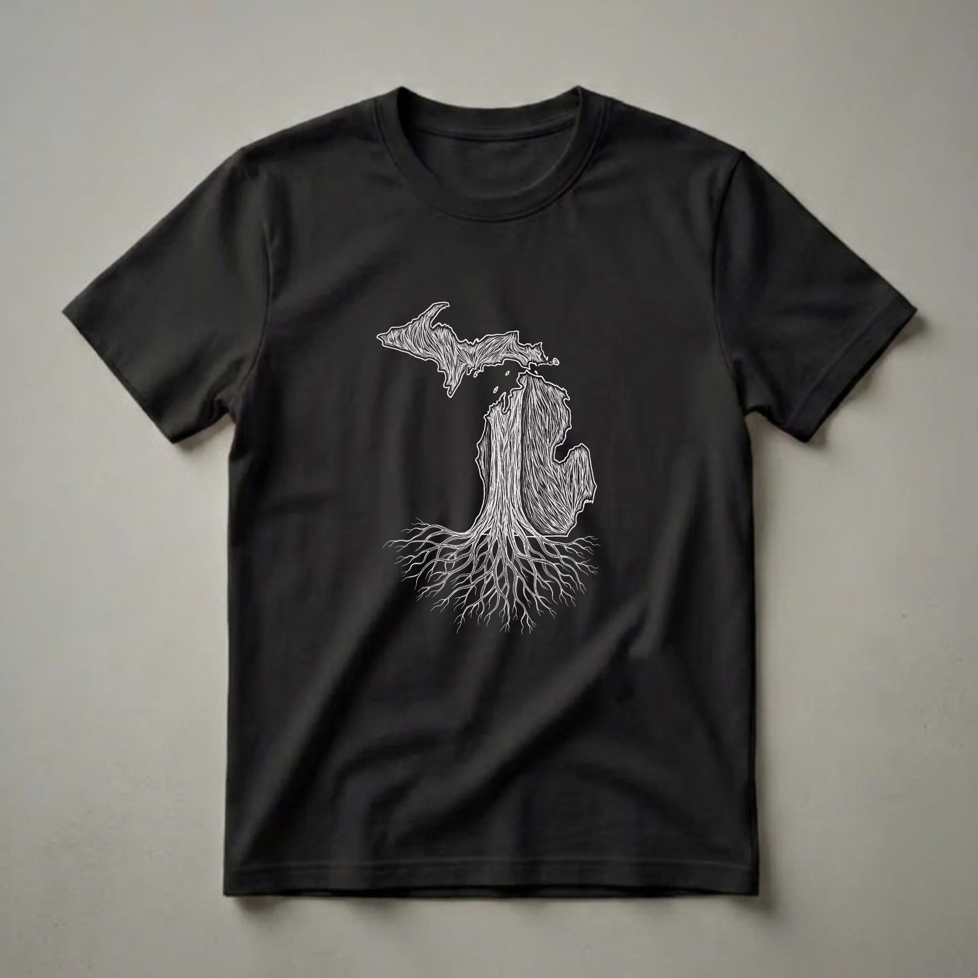 - Features a unique sketch art design of Michigan with deep roots.