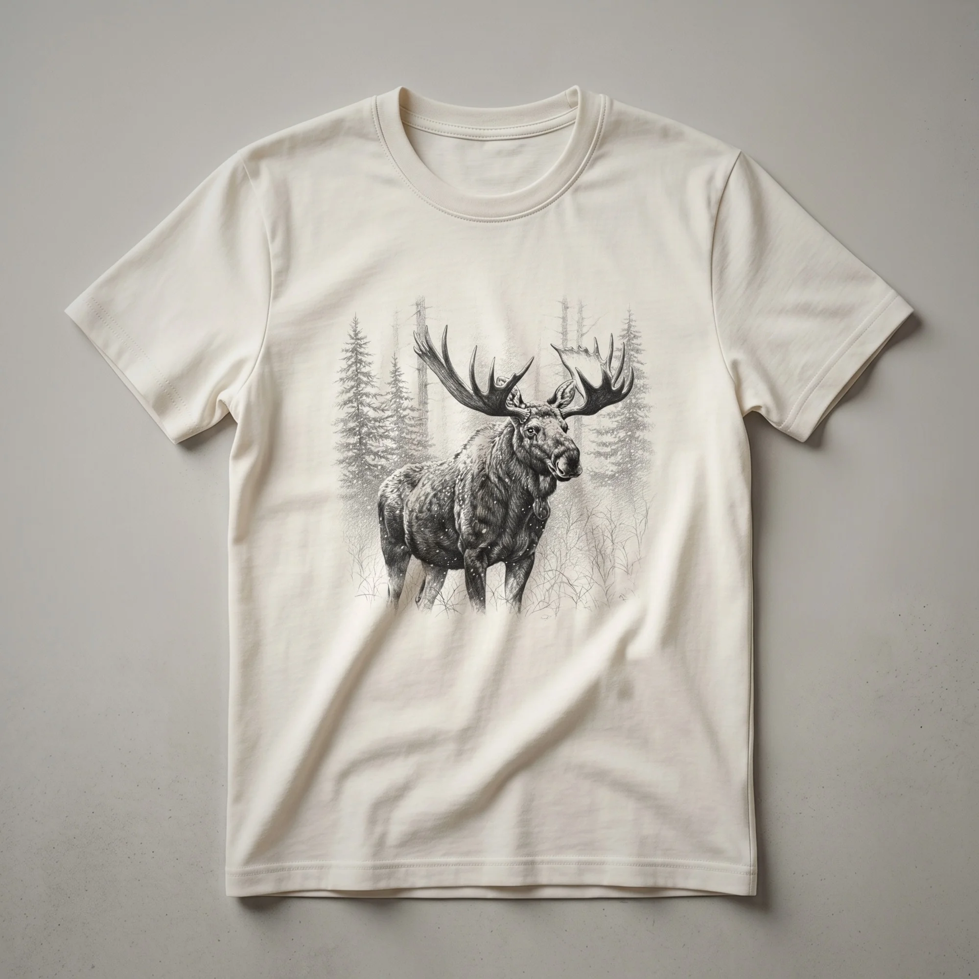 Embrace the wild with this vintage-inspired graphic tee, showcasing a majestic moose head illustration that speaks to nature lovers. The design features a detailed, vintage-style illustration of a moose's head, complete with impressive antlers, rendered in a classic drawing aesthetic. This t-shirt is a thoughtful gift for anyone who feels a connection to the great outdoors and the powerful creatures that inhabit it. Moose, known for their solitary nature and impressive size, are iconic symbols of wilderness and resilience. They are the largest members of the deer family and can be found in boreal forests and temperate broadleaf and mixed forests across North America and Eurasia. This shirt is a great way to express your admiration for these magnificent animals. Wear this tee on your next hike, to a casual outing, or simply while enjoying nature. It’s a staple in the collection for any nature lover, offering a blend of style and a nod to the wild. This apparel is a conversation starter for those who admire the rugged beauty of the natural world and its inhabitants.
