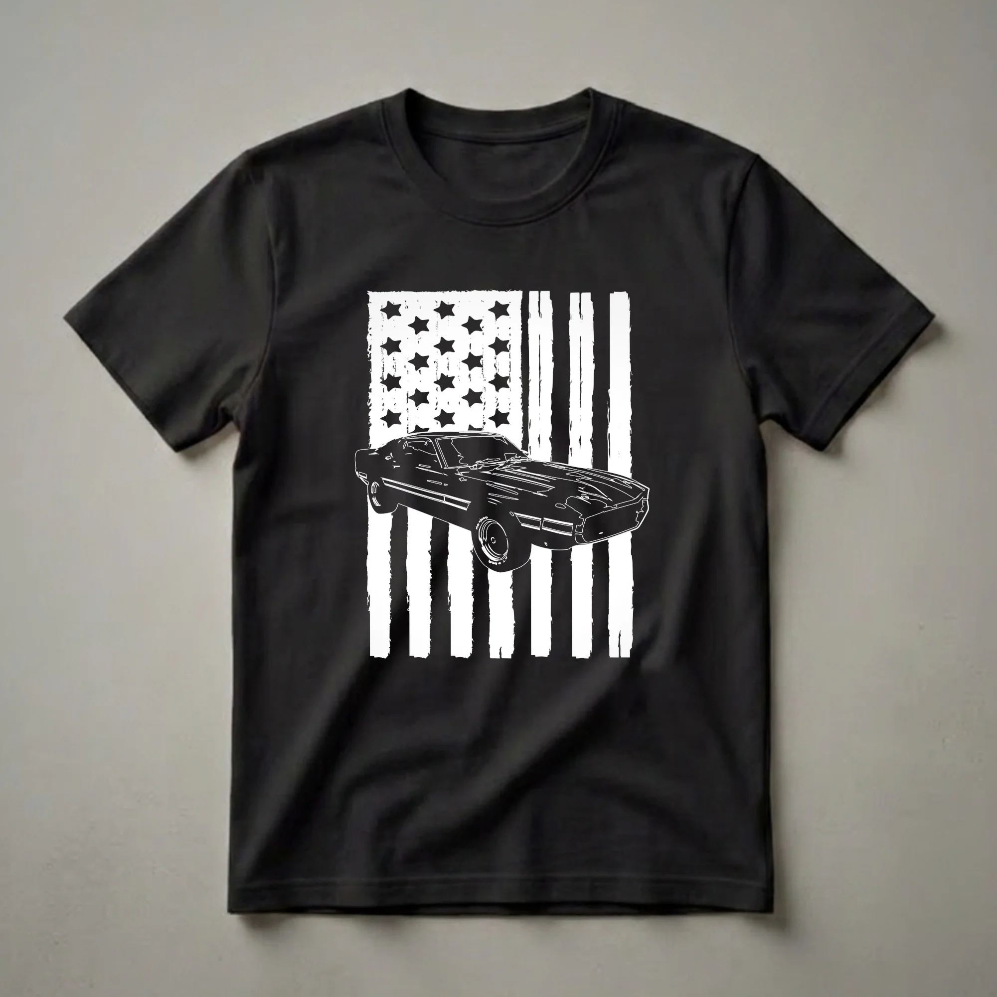 Drag racing enthusiasts who appreciate classic American automotive design will gravitate towards this eye-catching graphic tee. The design features a bold, outlined illustration of a vintage muscle car, reminiscent of the powerful vehicles that dominated drag strips in the 60s and 70s. This iconic car is presented against a distressed American flag, with its white stars and stripes rendered in a stark, high-contrast black and white. The distressed texture of the flag adds a rugged, worn-in feel, evoking the spirit of classic racing culture. This shirt is a thoughtful gift for any man who loves the roar of a V8 engine and the thrill of a quarter-mile sprint. It's a go-to tee for casual wear, well suited for attending car shows, race events, or simply cruising on a sunny afternoon. The graphic captures the essence of American automotive heritage and the adrenaline-fueled world of drag racing, making it a staple for those who live and breathe horsepower. This apparel celebrates the raw power and iconic style of American muscle cars.