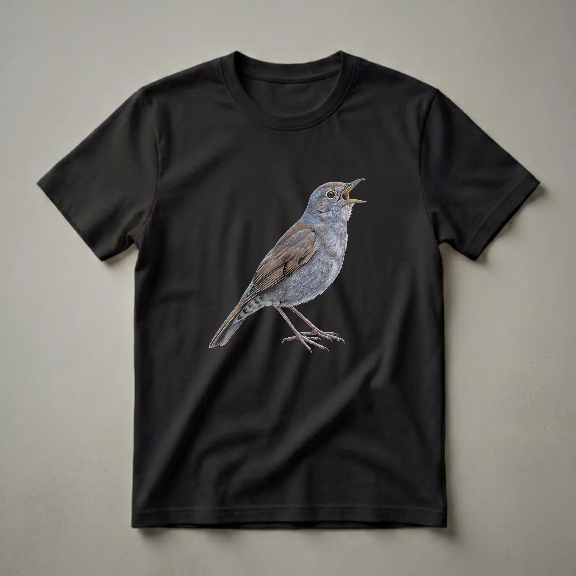 Bird watchers and nature enthusiasts will appreciate the intricate detail of this vintage nightingale bird drawing t-shirt. The artwork depicts a single nightingale, rendered in a classic drawing style, with its beak open as if in full song. Its plumage is a delicate blend of blues, grays, and browns, showcasing the artist's skill in capturing the subtle textures of feathers. The bird stands on slender legs, its talons clearly defined, adding to the realism of the piece. This striking graphic tee is a thoughtful gift for anyone who finds joy in the natural world and the melodies of songbirds. Nightingales are renowned for their beautiful and complex songs, often heard at dusk and dawn, making this shirt a perfect tribute to these vocal wonders. This t-shirt works well for casual outings, nature walks, or simply relaxing at home while appreciating the beauty of wildlife art. It's a staple for anyone who loves to observe and identify birds in their natural habitat.