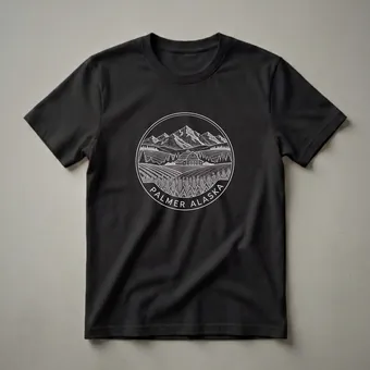Palmer, Alaska, is a community nestled in the Matanuska Valley, known for its agricultural roots and stunning mountain backdrop. This graphic tee captures that essence with a detailed sketch-style design. The artwork is enclosed within a circular emblem, showcasing a classic red barn situated amidst rolling fields of wheat or barley, with pine trees framing the scene. In the distance, majestic, snow-capped mountains rise against the horizon, evoking the rugged beauty of the Alaskan wilderness. The text 'PALMER ALASKA' curves along the bottom of the emblem, solidifying the location's identity. This shirt is a thoughtful gift for anyone who has a connection to Palmer, whether they are a resident, a former visitor, or simply appreciate the unique charm of Alaskan landscapes. It's a go-to tee for casual outings, hikes, or simply relaxing while reminiscing about the Last Frontier. The Matanuska Valley is one of Alaska's primary agricultural regions, and this design celebrates that heritage. Wear this t-shirt to express your pride in Palmer or as a reminder of the vast, beautiful scenery that defines this northern community. It's a piece of apparel that tells a story of place and nature.