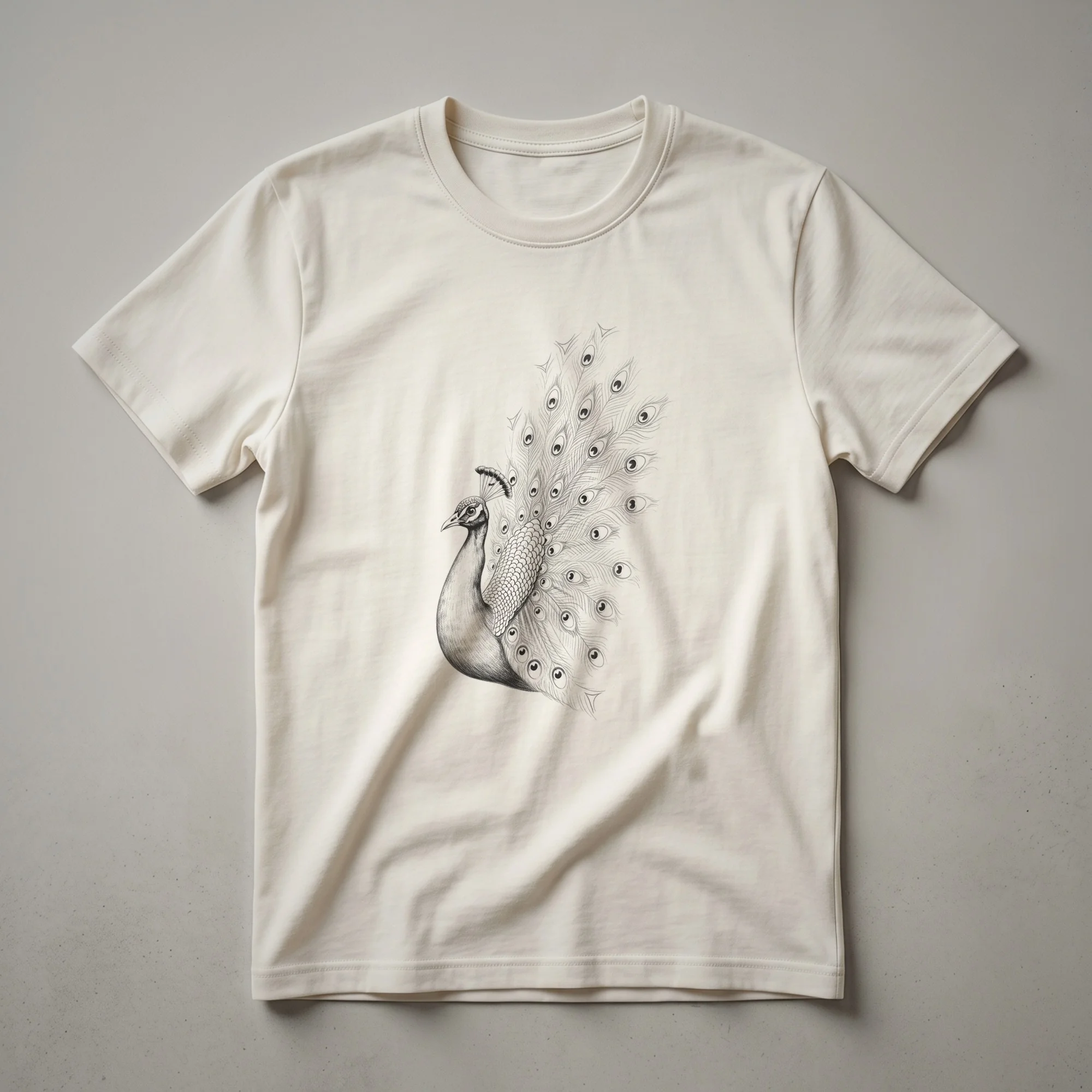 - Adorn yourself with avian artistry: a vintage peacock line drawing on a unique graphic tee.