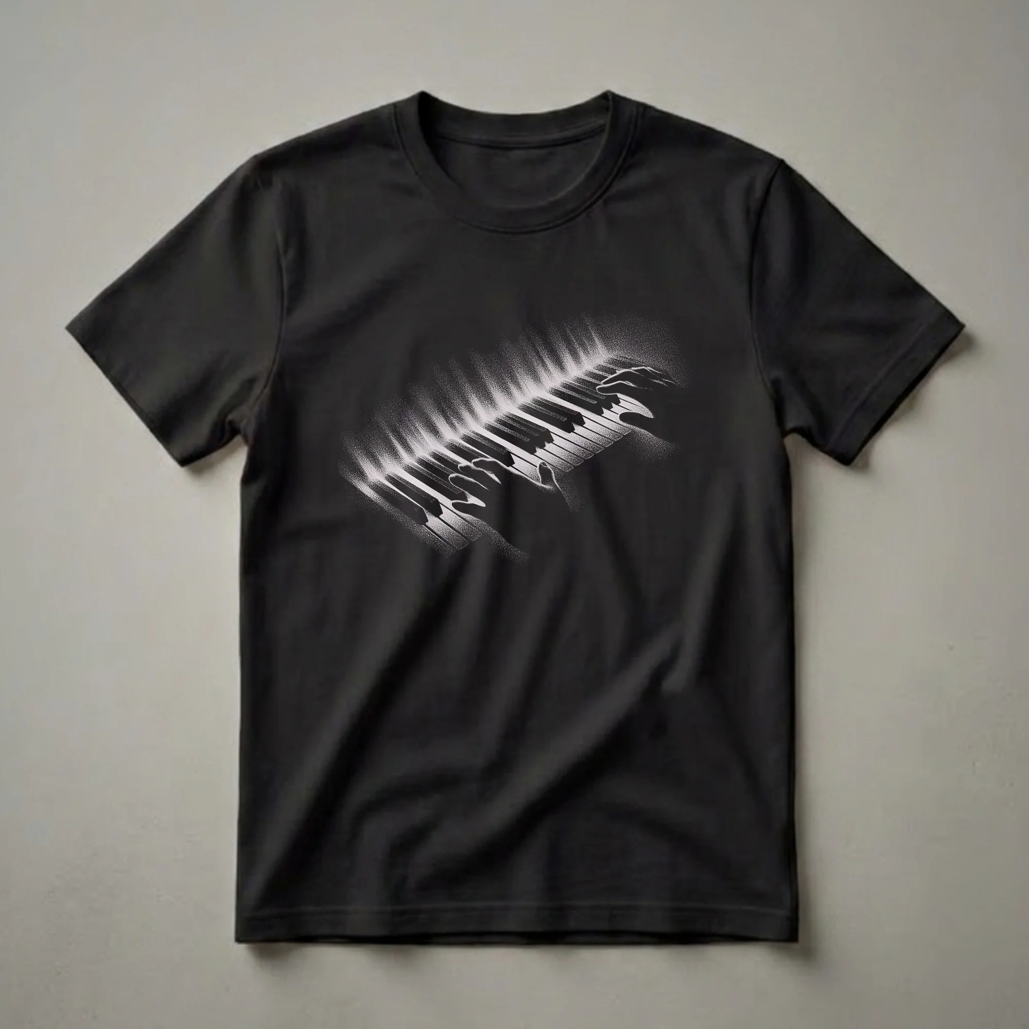 - A striking stippled art t-shirt for pianists and piano lovers.