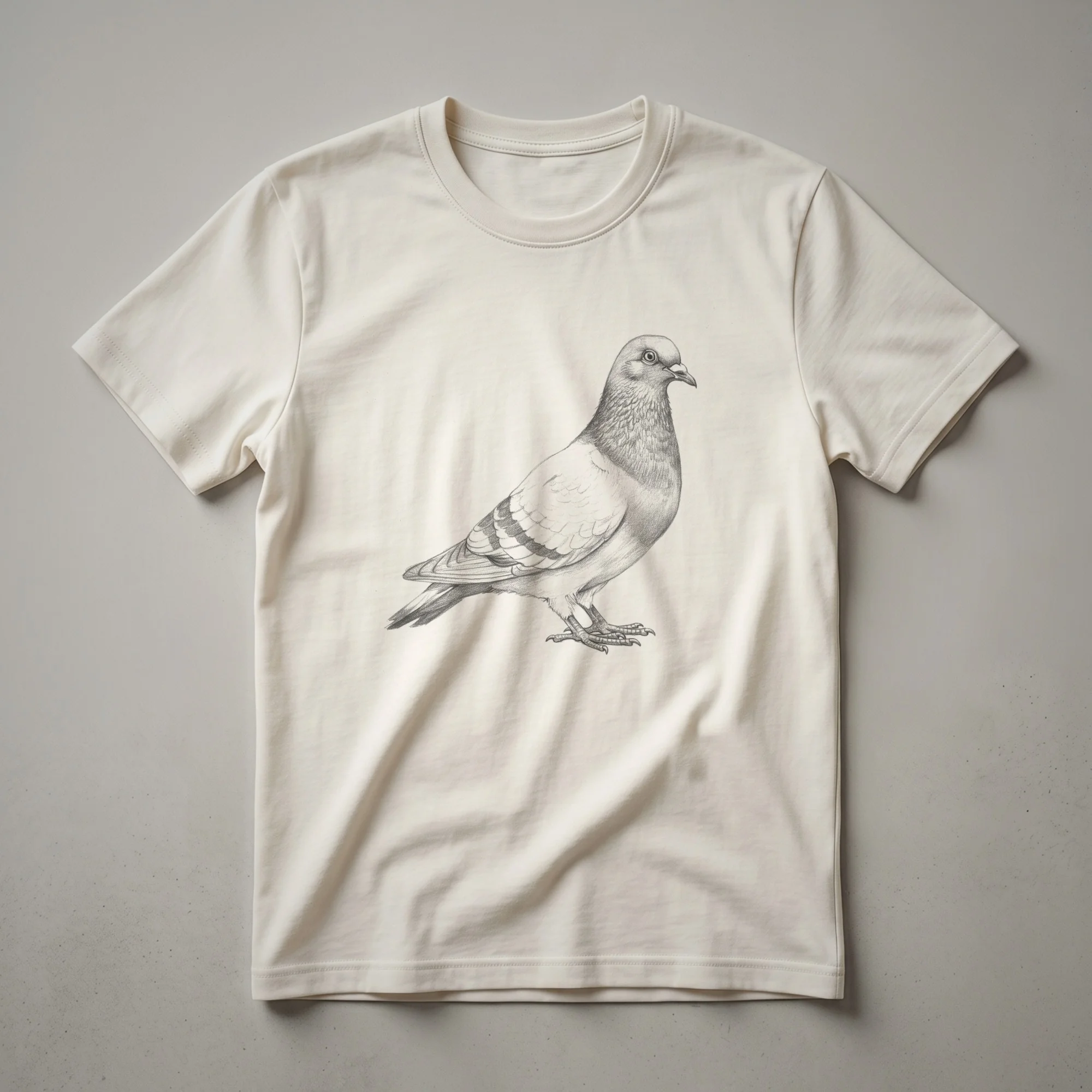 Bird watchers and urban wildlife admirers will appreciate this striking t-shirt featuring a detailed sketch of a pigeon. The design captures the familiar silhouette of the common pigeon, also known as the rock dove, with delicate linework highlighting its feathers and form. Pigeons are found worldwide, adapting to diverse environments from city streets to coastal cliffs, making them a symbol of resilience and adaptability. This graphic tee is a staple in the collection for anyone who finds beauty in these often-overlooked urban birds. It makes a thoughtful gift for the ornithologist in your life or a unique addition to your own casual wear. Wear this shirt to your next nature walk or while observing local wildlife. This pigeon shirt offers a touch of vintage charm and a nod to the natural world, a thoughtful choice for everyday wear.