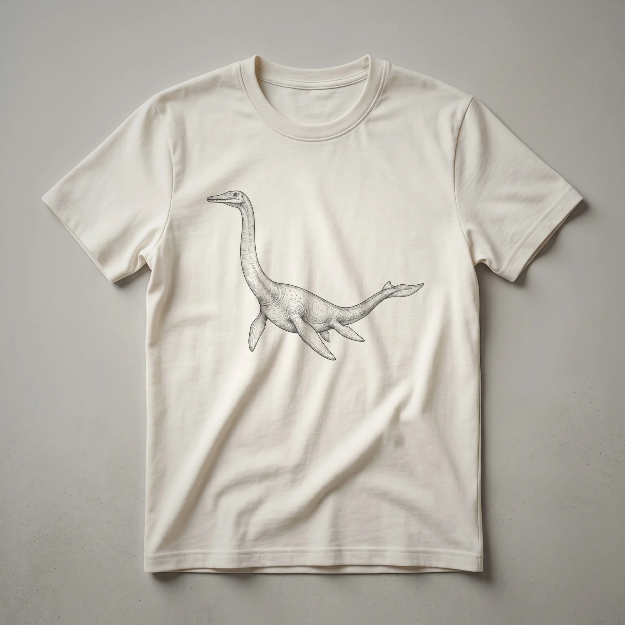 Paleontology enthusiasts will appreciate the detailed line art of this vintage plesiosaur drawing t-shirt. The graphic features a plesiosaur, a marine reptile that lived during the Mesozoic Era, depicted in a classic, hand-drawn style. Plesiosaurs were characterized by their long necks, small heads, and four large flippers, which they used for swimming in ancient oceans. This particular depiction captures the creature in a swimming pose, showcasing its aquatic adaptation. The artwork evokes a sense of historical discovery and the wonder of extinct creatures. This tee is a thoughtful gift for anyone fascinated by ancient marine life, fossil hunters, or those who enjoy unique wildlife art. It's a great conversation starter for casual outings, museum visits, or any occasion where you want to display your passion for prehistoric worlds. Wear this shirt to express your interest in the deep past and the incredible creatures that once roamed the Earth's oceans. This apparel is a staple for any aspiring paleontologist.