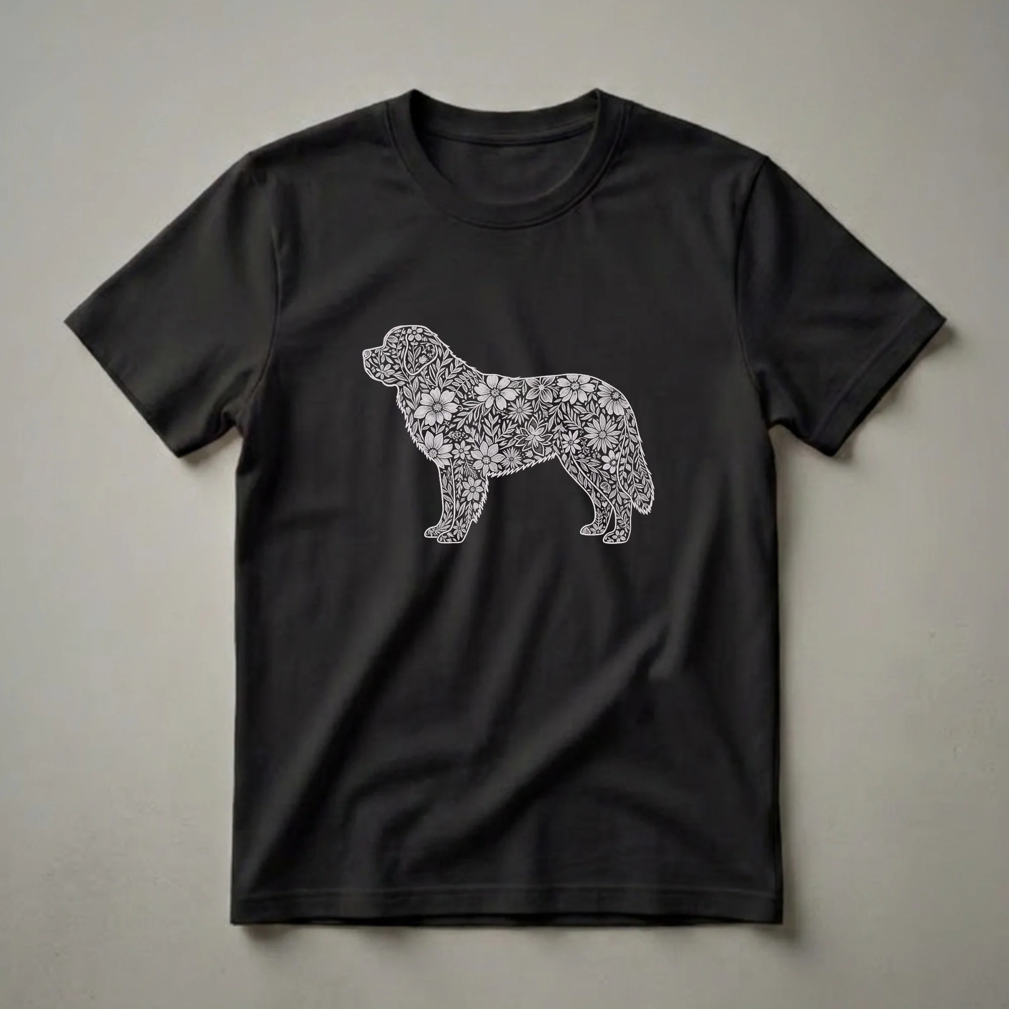 Saint Bernard owners who appreciate unique artistry will reach for this striking graphic tee. The design features a detailed outline of a Saint Bernard, meticulously filled with an intricate pattern of vintage-style flowers and leaves. This eye-catching artwork transforms the gentle giant breed into a botanical masterpiece. Saint Bernards, originally from the Swiss Alps, were bred as rescue dogs, known for their calm temperament and incredible strength, often navigating treacherous snowy terrain. This shirt is a thoughtful gift for any Saint Bernard mom or dad, or for anyone who admires these majestic animals and their rich history. It's a unique way to express your passion for dogs and nature's beauty. Wear this tee to your next dog park visit or casual outing to spark conversations about your favorite breed. This t-shirt is a staple for any dog lover's wardrobe, blending artistic flair with canine appreciation. The detailed floral fill offers a sophisticated take on animal-themed apparel, making it stand out from typical dog shirts. It's a wonderful way to celebrate the bond between humans and these loyal companions, showcasing a blend of natural elements and canine form.