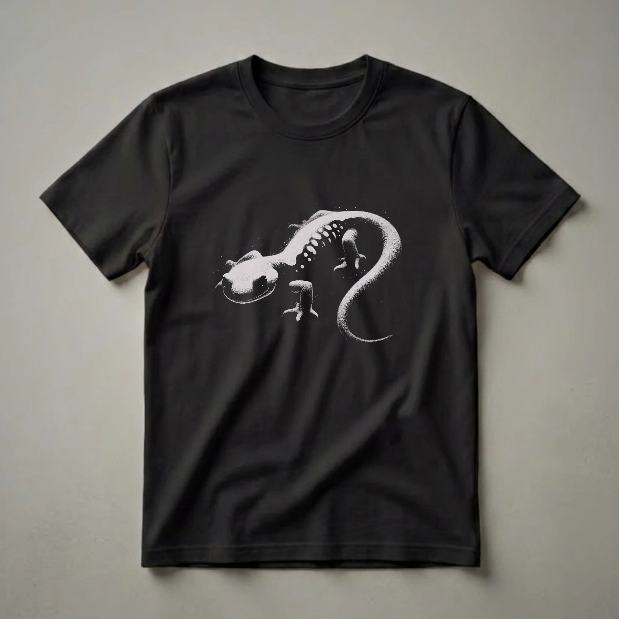 Salamander enthusiasts will appreciate the intricate stipple art featured on this unique t-shirt. The design showcases a detailed drawing of a salamander, rendered with a stippling technique that gives it a vintage, textured appearance against a stark black background. Salamanders are fascinating amphibians, known for their moist skin and ability to regenerate limbs, often found in damp environments like forests and near water sources. This graphic tee is a thoughtful gift for anyone who admires these elusive creatures or enjoys wildlife art. It's a go-to tee for casual outings, nature walks, or simply relaxing at home while celebrating your passion for the natural world. Wear this shirt to express your connection to the wild and its diverse inhabitants, making it a staple for any nature lover's wardrobe.