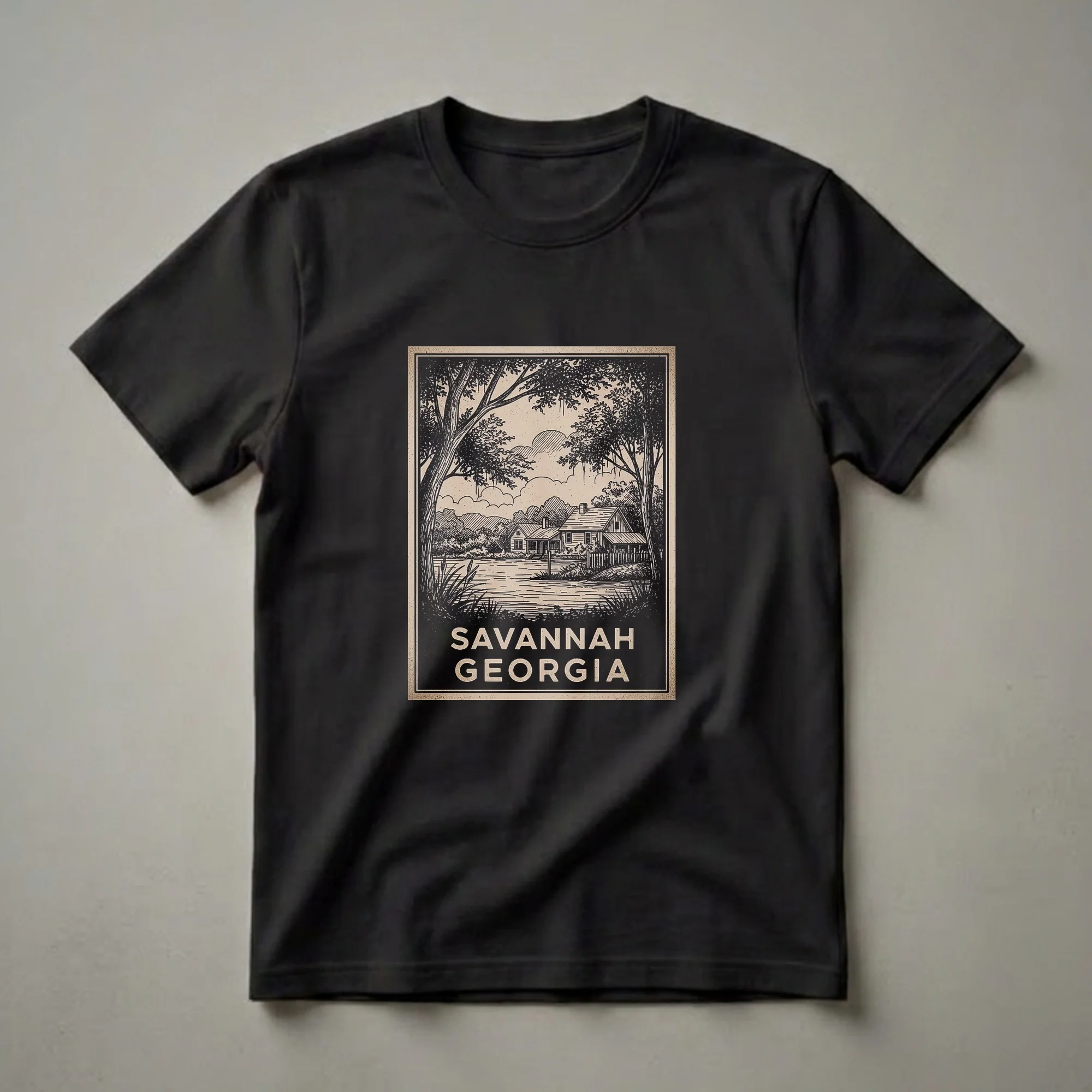 Savannah, Georgia's charm is captured in this vintage-style graphic tee, featuring a detailed line drawing that evokes the city's historic beauty. The artwork depicts a serene waterside scene with traditional Southern homes nestled among lush trees, reminiscent of the city's iconic squares and antebellum architecture. Savannah, founded in 1733, is known for its cobblestone streets, historic squares, and Spanish moss-draped oaks, creating a picturesque backdrop for this design. This shirt is a thoughtful gift for anyone who has lived in or visited Savannah, or for those who appreciate Southern heritage and classic art styles. It's a go-to tee for casual outings, exploring the city, or simply reminiscing about its unique atmosphere. Wear this t-shirt to remember your favorite Georgia getaway or to express your pride in this beautiful coastal city. The intricate drawing style adds a touch of timeless elegance, making it a standout piece for any wardrobe. This apparel celebrates the enduring appeal of Savannah, a city rich in history and natural splendor.