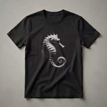 Marine life enthusiasts who appreciate the intricate beauty of the ocean will reach for this unique seahorse graphic tee. The design features a detailed stippled drawing of a seahorse, rendered in a vintage style against a stark black background. This artistic representation highlights the creature's distinctive curled tail and spiky dorsal fin, showcasing the delicate textures achieved through the stippling technique. Seahorses, belonging to the genus *Hippocampus*, are fascinating marine fish known for their upright posture and the male's role in carrying the eggs. They inhabit shallow seagrass beds, coral reefs, and estuaries in temperate and tropical waters worldwide. This shirt is a thoughtful gift for anyone captivated by the underwater world, whether they are divers, marine biologists, or simply admirers of ocean fauna. Wear this tee to the aquarium, a beach day, or casual outings to express your passion for these enchanting sea creatures. It's a staple in the collection for those who find beauty in the ocean's diverse inhabitants.