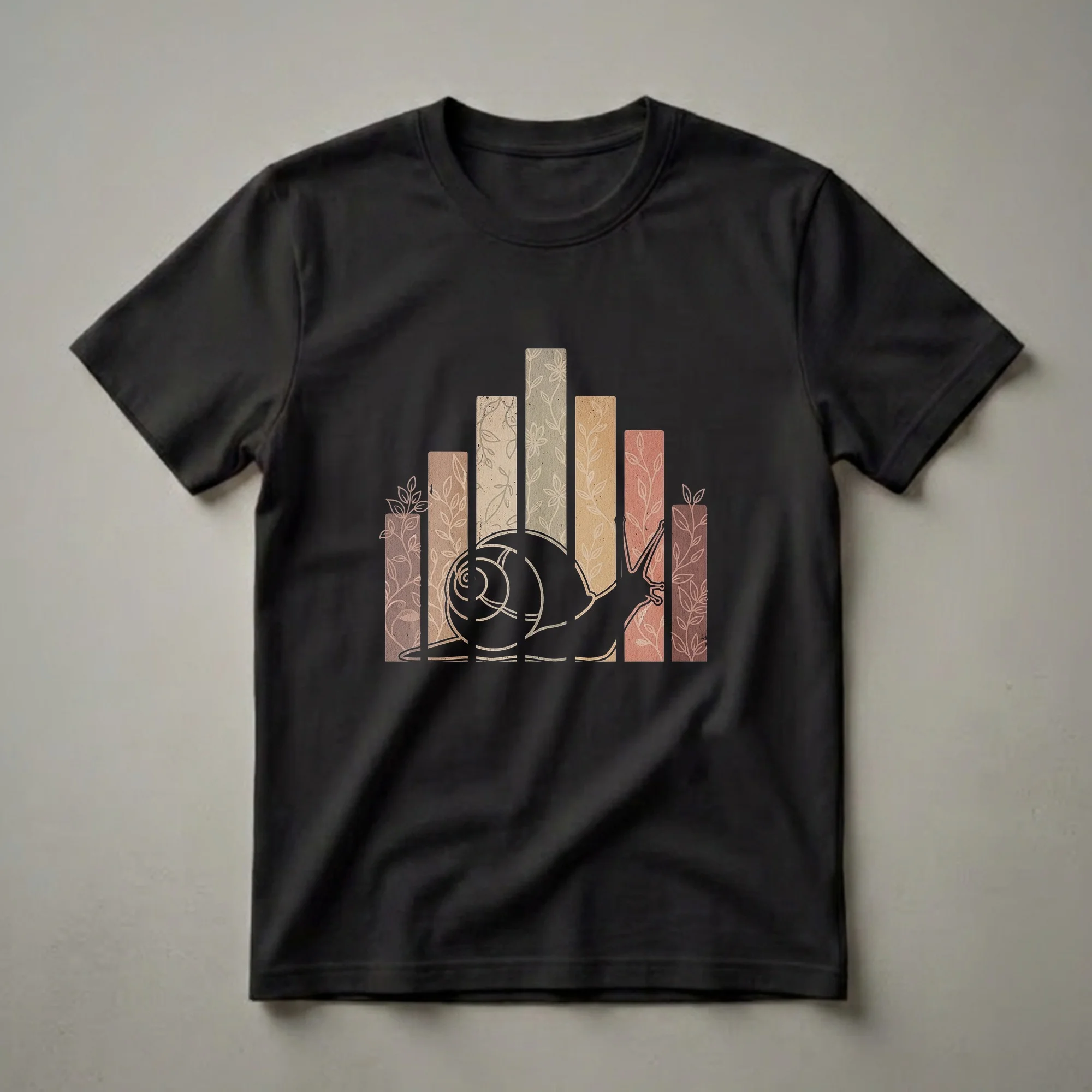 Gardeners and nature enthusiasts who appreciate the slow beauty of the natural world will reach for this unique snail graphic tee. The design showcases a striking silhouette of a snail, its shell intricately detailed with concentric lines, moving across a backdrop of vertical bars. These bars are textured and colored in muted, earthy tones of beige, tan, rust, and muted green, each adorned with delicate, hand-drawn floral and vine patterns. Snails, belonging to the gastropod class, are known for their slow, deliberate movement and are often found in damp environments like gardens and forests, playing a vital role in decomposition and nutrient cycling. This t-shirt captures that serene, organic aesthetic, making it a thoughtful gift for anyone who finds joy in the subtle wonders of the outdoors. It's a staple in the collection for those who love to wear their appreciation for wildlife and botanical art. Wear this shirt on your next nature walk, to a botanical garden visit, or simply while enjoying a quiet afternoon at home.