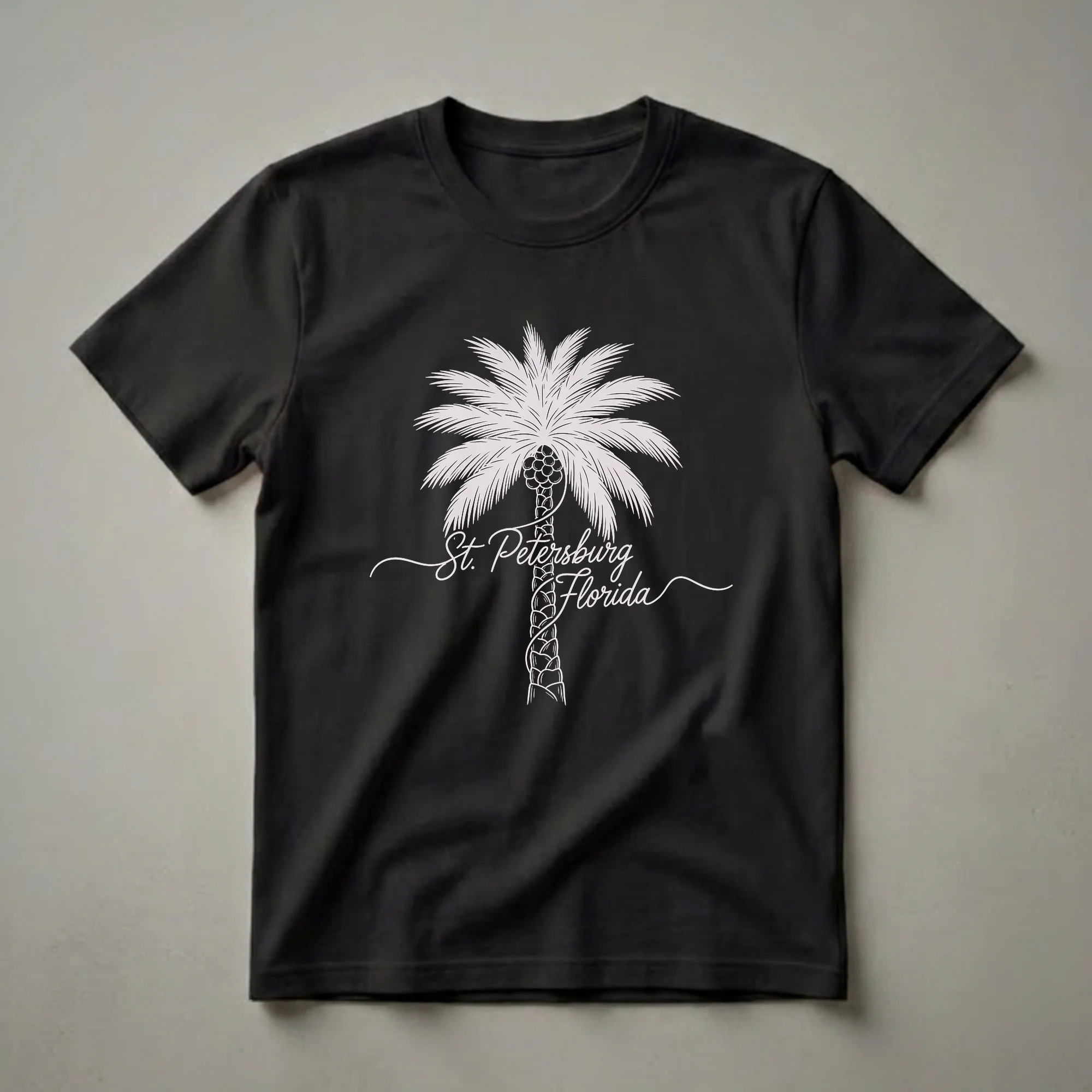 St. Petersburg, Florida, a vibrant city on the Pinellas Peninsula, is celebrated with this striking graphic tee. The design features a detailed line drawing of a classic palm tree, its fronds fanning out against a dark background, evoking the warm, tropical atmosphere of the Sunshine State. Below the iconic tree, the words "St. Petersburg Florida" are elegantly scripted, capturing the essence of this beloved coastal destination. St. Petersburg is renowned for its beautiful beaches, thriving arts scene, and the Dali Museum, making it a popular spot for both residents and tourists. This shirt is a thoughtful gift for anyone who has fond memories of visiting or living in St. Pete, or for those who dream of its sunny shores. Wear this comfortable tee to the beach, on a casual outing, or while reminiscing about your Florida adventures. It's a staple for any wardrobe celebrating the unique charm of the Gulf Coast. This t-shirt serves as a wearable postcard, bringing a piece of Florida's coastal beauty wherever you go. It's a go-to tee for those who appreciate vintage travel aesthetics and the relaxed vibe of the Sunshine State.