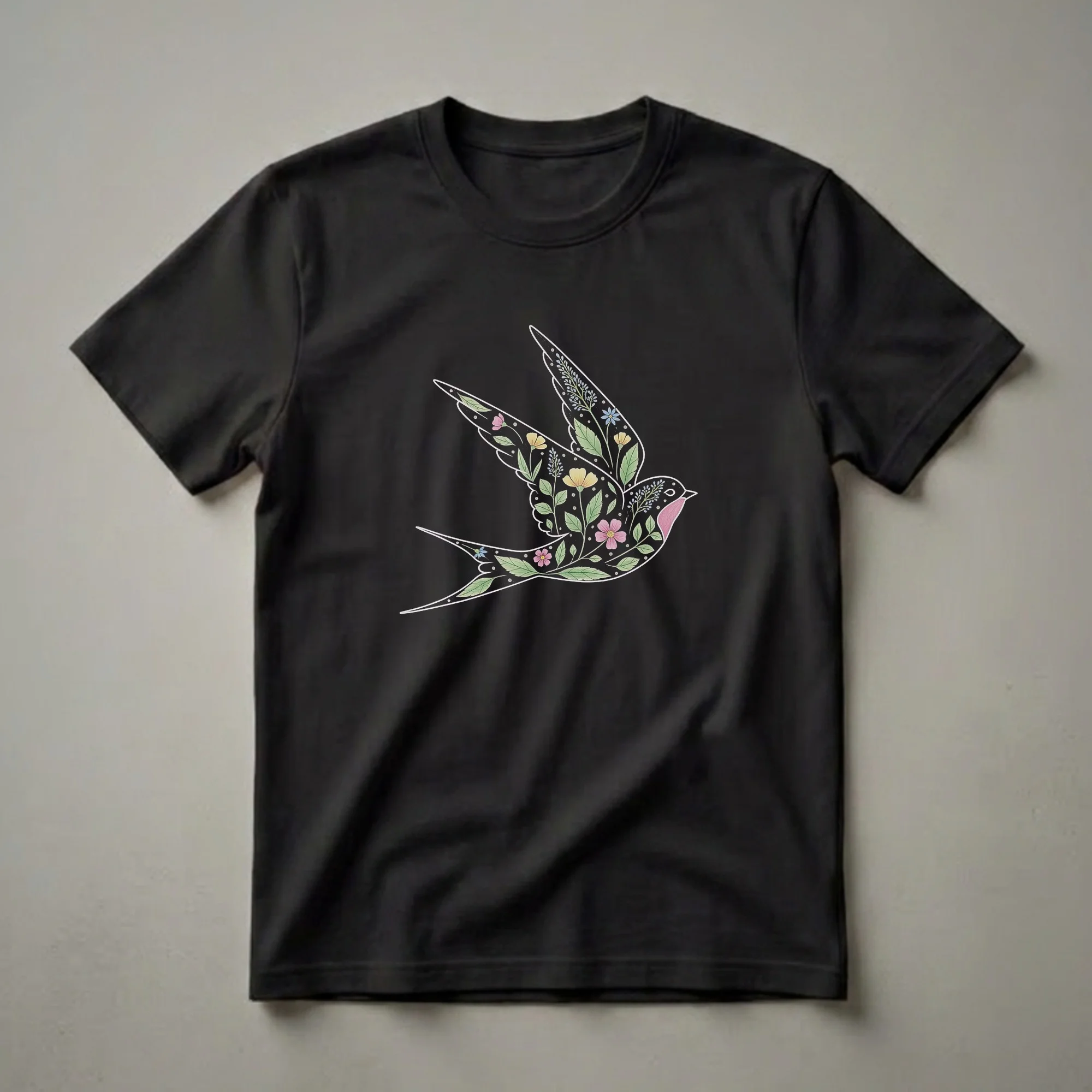 Nature lovers and birdwatchers will appreciate this striking t-shirt featuring a vintage-style drawing of a swallow in flight. The bird's wings and body are intricately filled with delicate floral patterns, including pink and yellow wildflowers, green leaves, and sprigs of blue blossoms. This artistic design evokes the beauty of spring and the natural world. Swallows are known for their acrobatic flight and are often seen near water sources, migrating thousands of miles each year. This graphic tee is a thoughtful gift for anyone who cherishes wildlife and unique artistic apparel. It's a go-to tee for casual outings, nature walks, or simply relaxing at home while celebrating your love for avian beauty. The detailed illustration makes this shirt a conversation starter for fellow enthusiasts. Wear this shirt to express your connection to the outdoors and the graceful flight of these migratory birds. This apparel is a wonderful way to carry a piece of nature with you wherever you go.