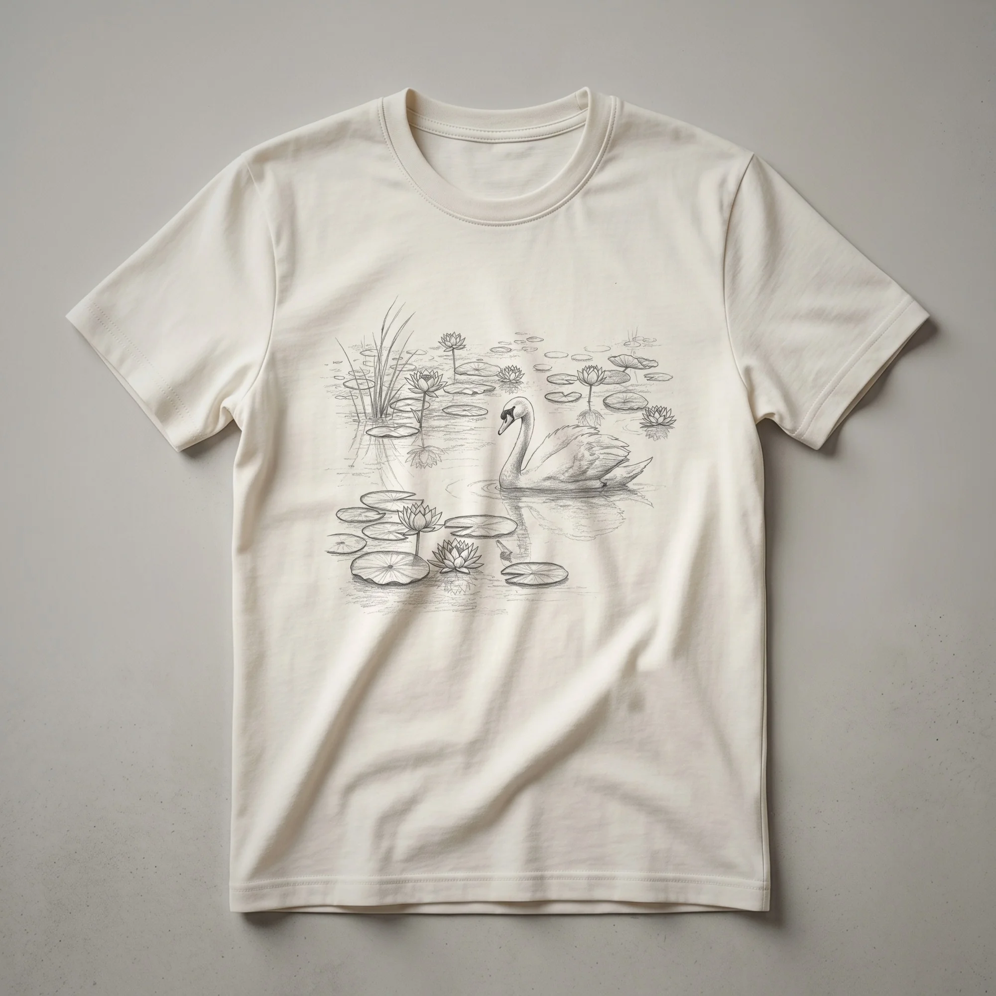 - This t-shirt showcases a graceful swan amidst delicate lotus flowers and lily pads, vintage art inspired.