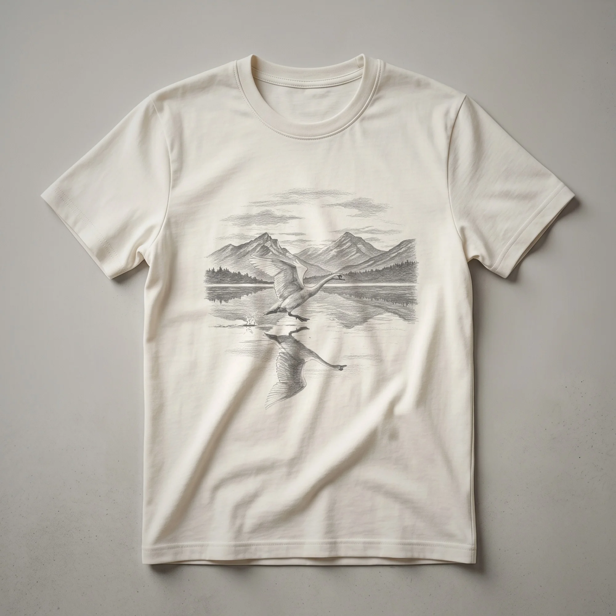 Nature lovers and wildlife enthusiasts will appreciate the serene beauty captured in this vintage-style t-shirt. The design showcases a graceful swan in mid-flight, its wings outstretched against a backdrop of majestic mountains and a tranquil lake. A dense forest line separates the water from the peaks, all rendered in a delicate, detailed line drawing. Swans, known for their elegance and often associated with grace and beauty, are found in freshwater habitats across Europe, Asia, and North America. This graphic tee is a thoughtful gift for anyone who cherishes the outdoors, birdwatching, or simply enjoys the peaceful aesthetic of natural landscapes. It's a unique piece of apparel that brings a touch of the wild to your everyday wardrobe. Wear this shirt on your next hike, to a casual outing, or simply while enjoying a quiet moment appreciating nature's artistry. This t-shirt is a staple for those who connect with the natural world.