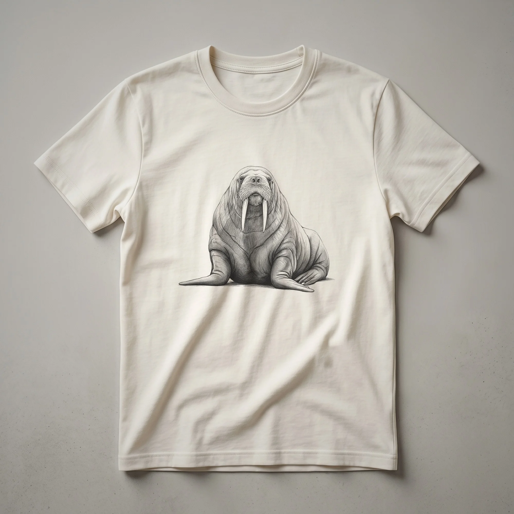Marine life enthusiasts will appreciate the detailed artistry of this vintage walrus line drawing t-shirt. The graphic features a majestic walrus, depicted with its characteristic tusks and whiskers, sitting in a frontal pose. This t-shirt is a thoughtful gift for anyone fascinated by the ocean's inhabitants, particularly those who admire the unique adaptations of Arctic mammals. Walruses are known for their impressive tusks, which they use for defense, breaking ice, and hauling themselves out of the water. They inhabit the Arctic waters of the Northern Hemisphere, often found resting on sea ice or beaches. This shirt works well for casual wear, whether you're heading to the beach, visiting an aquarium, or simply want to express your connection to the natural world. It's a staple piece for those who enjoy wildlife art and want to wear their passion. This graphic tee offers a striking visual that sparks conversation about these incredible creatures and their environment. It makes a thoughtful gift for the marine biologist, diver, or nature lover in your life who cherishes the ocean's wonders.