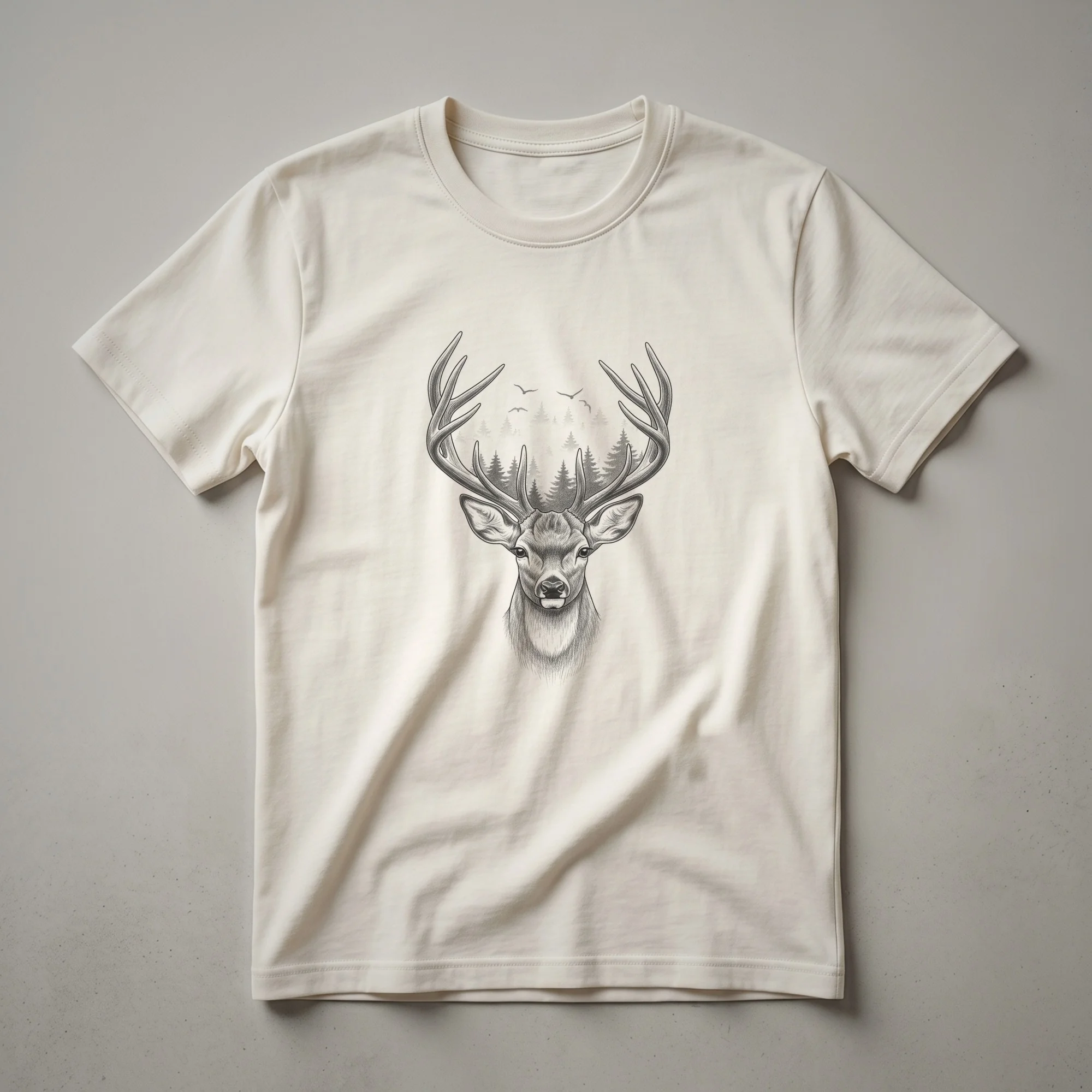 Whitetail deer, known for their impressive antlers and keen senses, are a symbol of the wild and a common sight in North American forests. This striking graphic tee features a detailed line drawing of a whitetail deer's head, complete with majestic antlers that frame a serene forest scene. The background subtly depicts evergreen trees, evoking the natural habitat of these magnificent creatures, while a few birds take flight above, adding a touch of dynamic movement to the composition. This shirt is a thoughtful gift for any wildlife enthusiast, hiker, or individual who appreciates the beauty of nature and the artistry of vintage wildlife illustrations. It's a go-to tee for casual outings, nature walks, or simply relaxing at home while dreaming of the great outdoors. The intricate detail of the drawing makes this t-shirt a conversation starter for anyone who shares a passion for woodland creatures and the untamed wilderness. Wear your appreciation for the natural world with this unique piece of apparel.