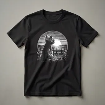 Yorkshire Terrier owners who appreciate classic artwork will reach for this unique graphic tee. The design features a detailed scratchboard illustration of a Yorkie, its silhouette set against a serene sunset over a field. A rustic wooden fence and tall grasses frame the scene, evoking a sense of peaceful contemplation. Yorkshire Terriers, originally bred in Yorkshire, England, for catching rats in clothing mills, are known for their spirited personalities and luxurious coats. This t-shirt captures a moment of quiet reflection, making it a staple for any dog lover's collection. It makes a thoughtful gift for the Yorkie mom or dad who cherishes their small but mighty companion. Wear this shirt to your next dog park visit or casual outing to spark conversations about your favorite breed. This eye-catching shirt is a wonderful way to celebrate the bond you share with your Yorkie.