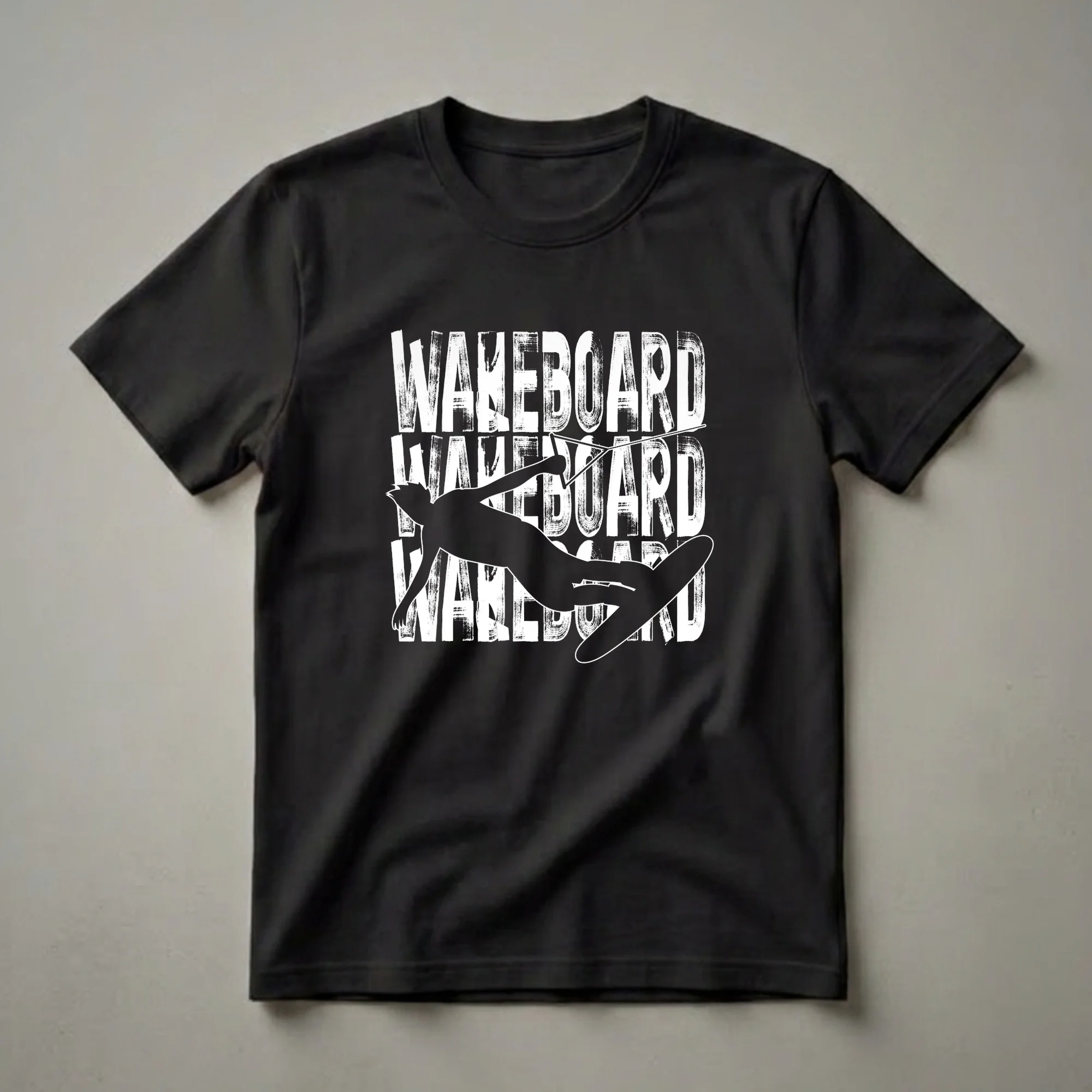 Wakeboard enthusiasts who live for the thrill of gliding across the water will appreciate this striking graphic t-shirt. The design features the word 'WAKEBOARD' repeated in a bold, distressed font, creating a dynamic visual that mirrors the energy of the sport. Centered within the text is a sharp black silhouette of a wakeboarder in mid-air, holding the tow rope and balanced on their board. This shirt is a staple for anyone who spends their summers on the lake or ocean, seeking that perfect ride. It makes a thoughtful gift for the wakeboarder in your life, whether they are a seasoned pro or just starting out. Wear this tee to the boat, the beach, or casual outings to express your love for wakeboarding. The repetitive word design emphasizes the core of the activity, making it instantly recognizable to fellow fans. This graphic tee is a go-to for expressing your dedication to water sports.