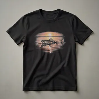 Walleye anglers who appreciate the beauty of a serene sunset will reach for this unique graphic tee. The artwork depicts a walleye fish breaching the water's surface as the sun dips below the horizon, casting warm orange and yellow hues across the sky and reflecting on the rippling water. This detailed drawing captures the essence of a peaceful fishing trip, a moment many fishermen cherish. Walleye, known for their keen eyesight and preference for murky waters, are a prized catch in many North American freshwater lakes and rivers. This shirt is a perfect way for fishermen to express their love for the sport and the natural world. It makes a thoughtful gift for the dad who spends his weekends on the lake or the friend who always talks about their latest catch. Wear this t-shirt on your next fishing excursion, to a casual gathering with fellow anglers, or simply as a comfortable everyday piece that celebrates your passion for the great outdoors and the thrill of the catch. This apparel is a staple for any fishing enthusiast's wardrobe.