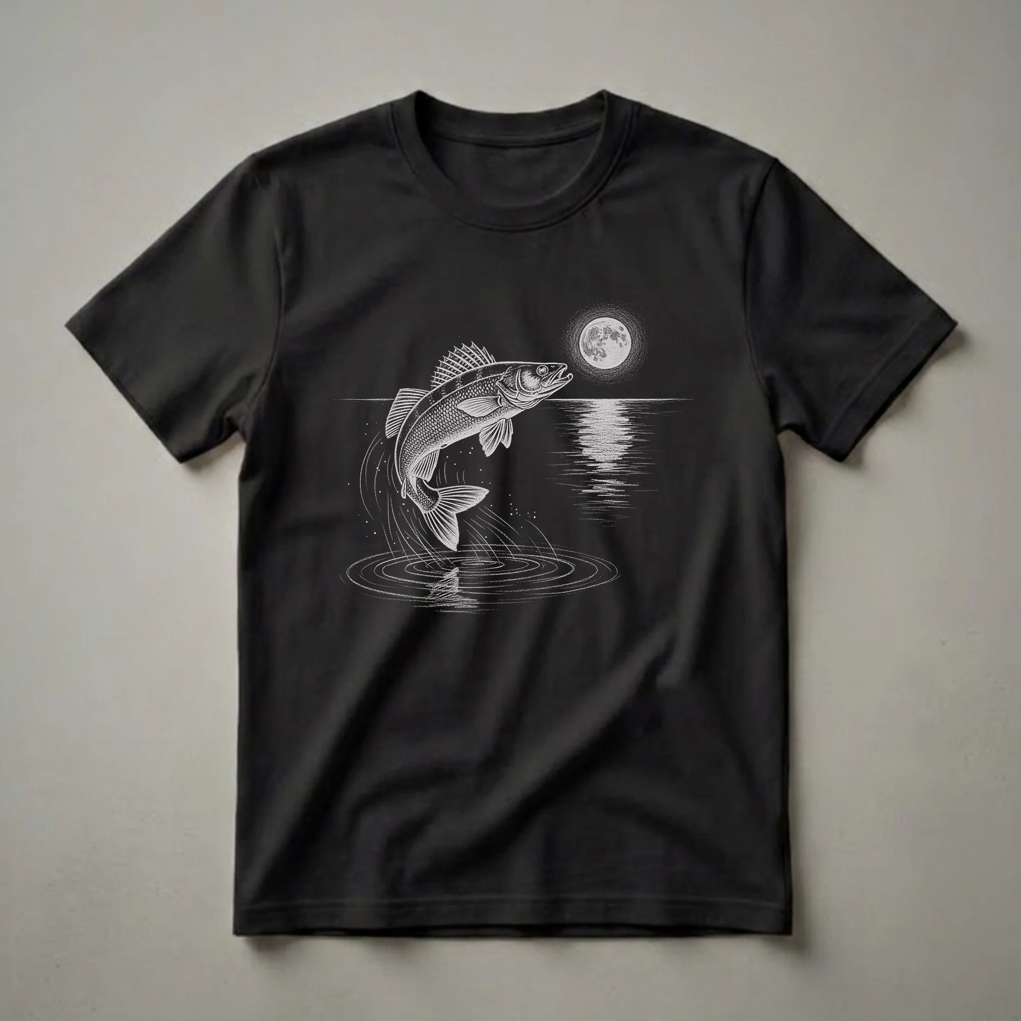Walleye anglers know the thrill of a night bite, especially when the moon is full. This striking graphic tee captures that excitement with a detailed sketch-style illustration of a walleye leaping from the water. The artwork features the fish in mid-air, its scales and fins rendered with fine detail, surrounded by ripples and splashes. Above, a luminous full moon hangs in the night sky, casting a shimmering reflection on the dark water. Walleye, known for their keen eyesight, are often more active during low-light conditions, making night fishing a popular pursuit for dedicated anglers. This shirt is a perfect way for any fisherman or fisherwoman to express their love for the sport. It makes a thoughtful gift for the dad who spends his weekends on the lake or the friend who always talks about their latest catch. Wear this t-shirt to your next fishing trip, to a casual outing with friends, or while planning your next adventure on the water. It's a staple for any fishing enthusiast's wardrobe, celebrating the pursuit of this prized freshwater game fish.