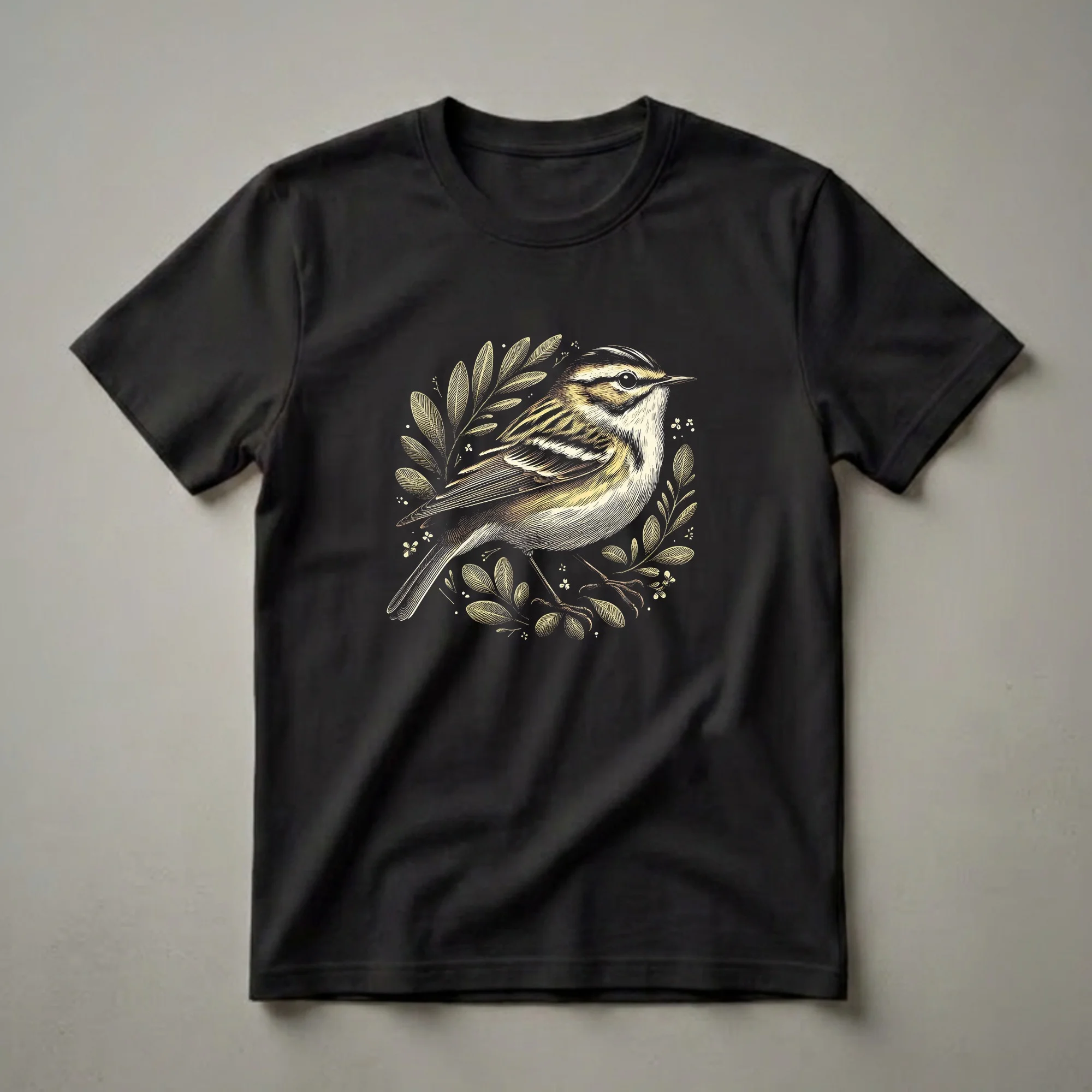 Nature lovers and birdwatchers will appreciate the intricate detail of this graphic tee, featuring a beautifully rendered warbler bird. The warbler, known for its energetic movements and varied songs, is depicted here perched within a circular arrangement of stylized leaves and delicate flowers. This artistic representation captures the essence of woodland wildlife with a vintage engraving aesthetic, utilizing a sophisticated palette of gold and brown hues against a deep black background. Warblers are a diverse group of birds, with many species found in North America, often inhabiting forests and shrublands where they forage for insects. This shirt is a thoughtful gift for anyone who cherves the natural world, particularly those who enjoy birdwatching or hiking through wooded trails. It makes a unique present for birthdays or holidays, offering a stylish way to express a passion for ornithology. Wear this eye-catching t-shirt to your next nature walk or casual outing, and let your appreciation for these small, vibrant creatures take flight.
