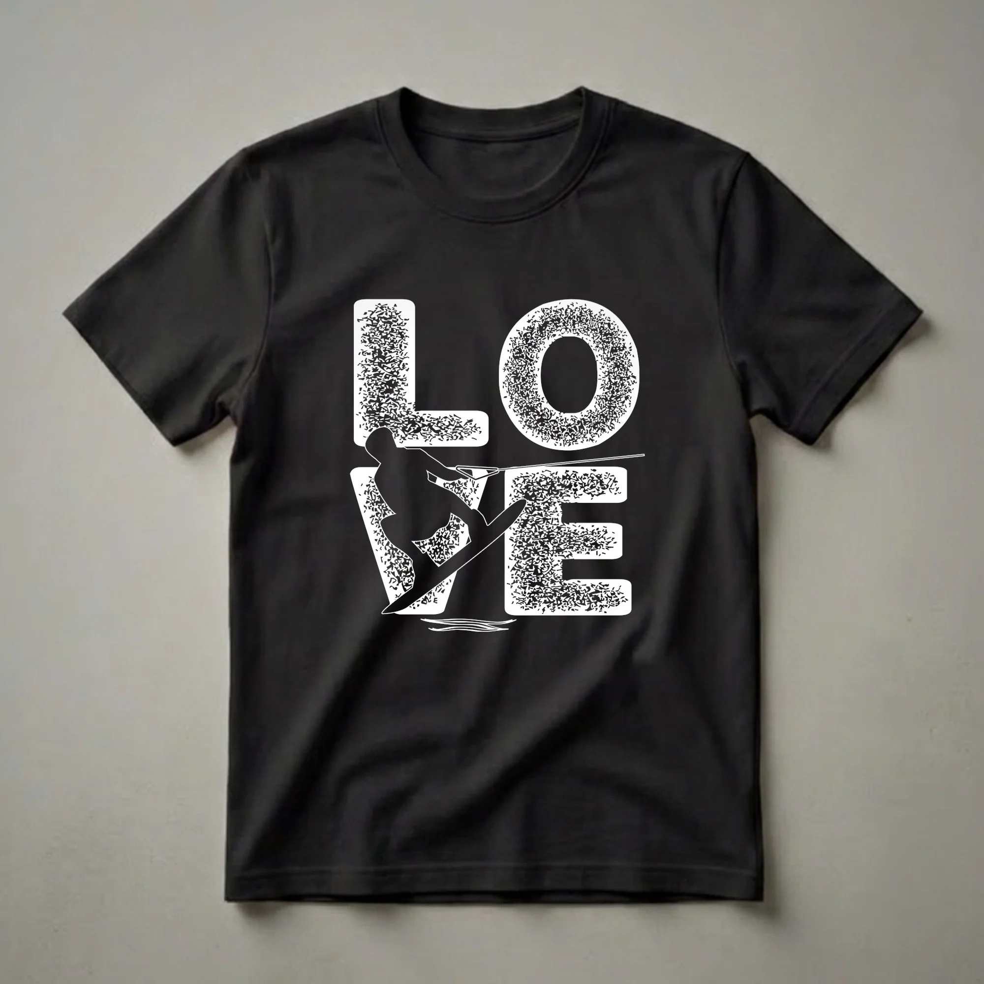 Water skiers who live for the thrill of gliding across the water will reach for this eye-catching graphic tee. The design boldly spells out 'LOVE' with the letter 'V' creatively replaced by the silhouette of a water skier in action, complete with a wake behind their board. This shirt is a fantastic way for any water sports enthusiast to showcase their dedication to the sport. Whether you're a seasoned pro or just starting out, this tee celebrates the joy and excitement of water skiing. It makes a thoughtful gift for the skier in your life, great to wear to the lake, beach, or casual outings. Embrace your love for the sport with this distinctive t-shirt, a staple for any water skiing aficionado's wardrobe. This apparel is a great conversation starter among fellow enthusiasts.