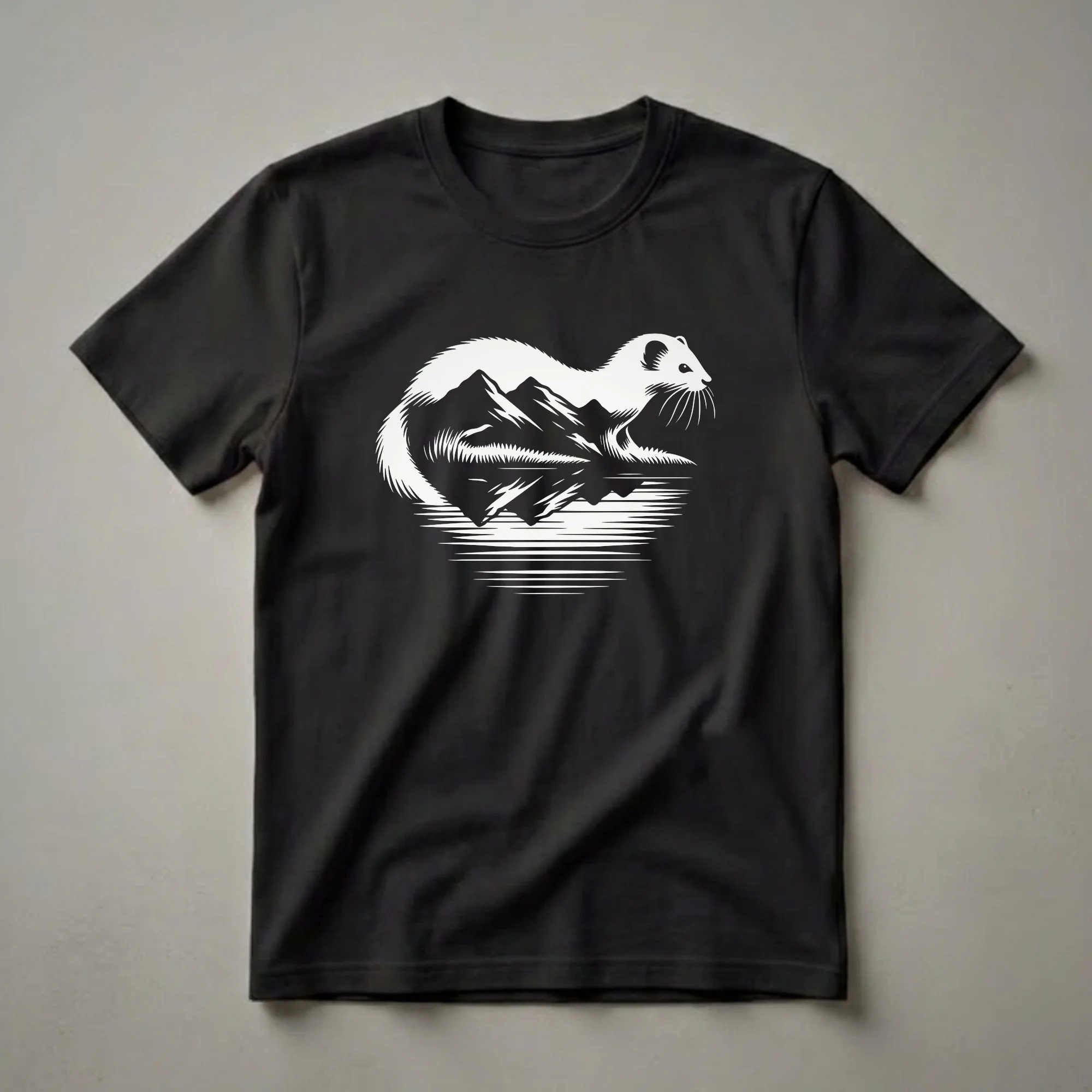 Wildlife enthusiasts and nature lovers will appreciate this unique graphic tee. The design features a sleek weasel, often found in mountainous regions and forests, depicted in profile. Its body curves to form a backdrop of rugged mountains, with a serene body of water reflecting the scene below. Weasels, known for their agility and adaptability, thrive in diverse habitats across North America, Europe, and Asia, often near forests and grasslands. This shirt is a thoughtful gift for anyone who admires the wild beauty of these creatures and their natural environments. Wear this t-shirt on your next hike, to a wildlife photography outing, or simply as a statement piece that celebrates the great outdoors. It's a go-to tee for those who feel a connection to the wilderness and its inhabitants. This apparel is a fantastic way to express your passion for the natural world.
